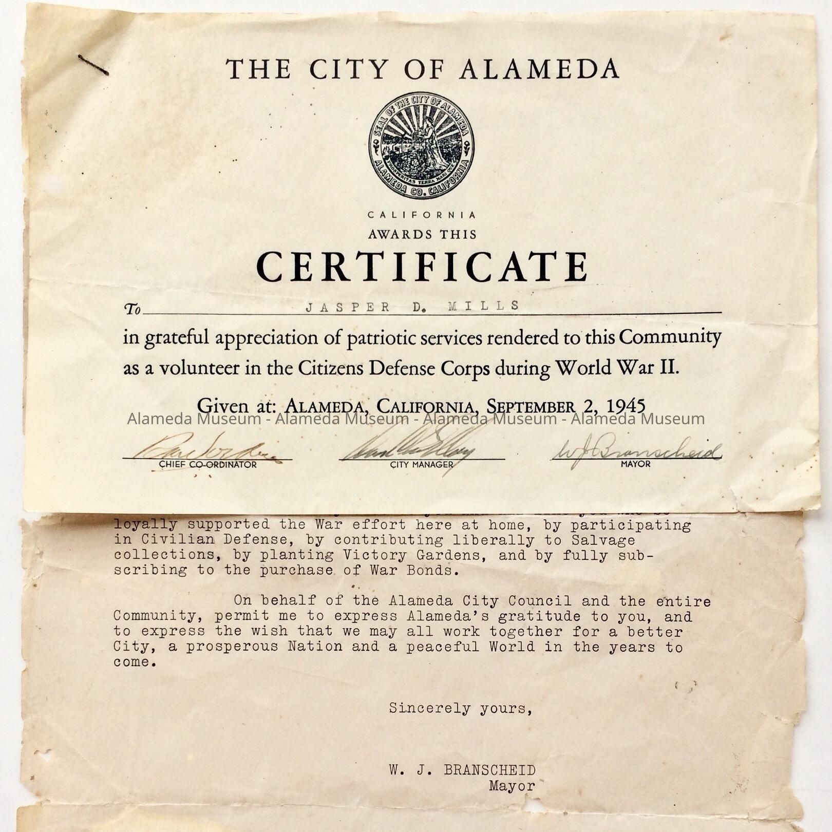 A CERTIFICATE AWARDED TO JASPER D. MILLS IN APPRECIATION OF HIS PATRIOTIC SERVICES AS A VOLUNTEER IN THE CITIZENS' DEFENSE CORPS DURING WW-II AND- DATED SEPTEMBER 22, 1945. ATTACHED IS A TYPEWRITTEN LETTER REPEATING THE CITY'S SENTIMENTS FOR HIS VOLUNTEER WORK.
