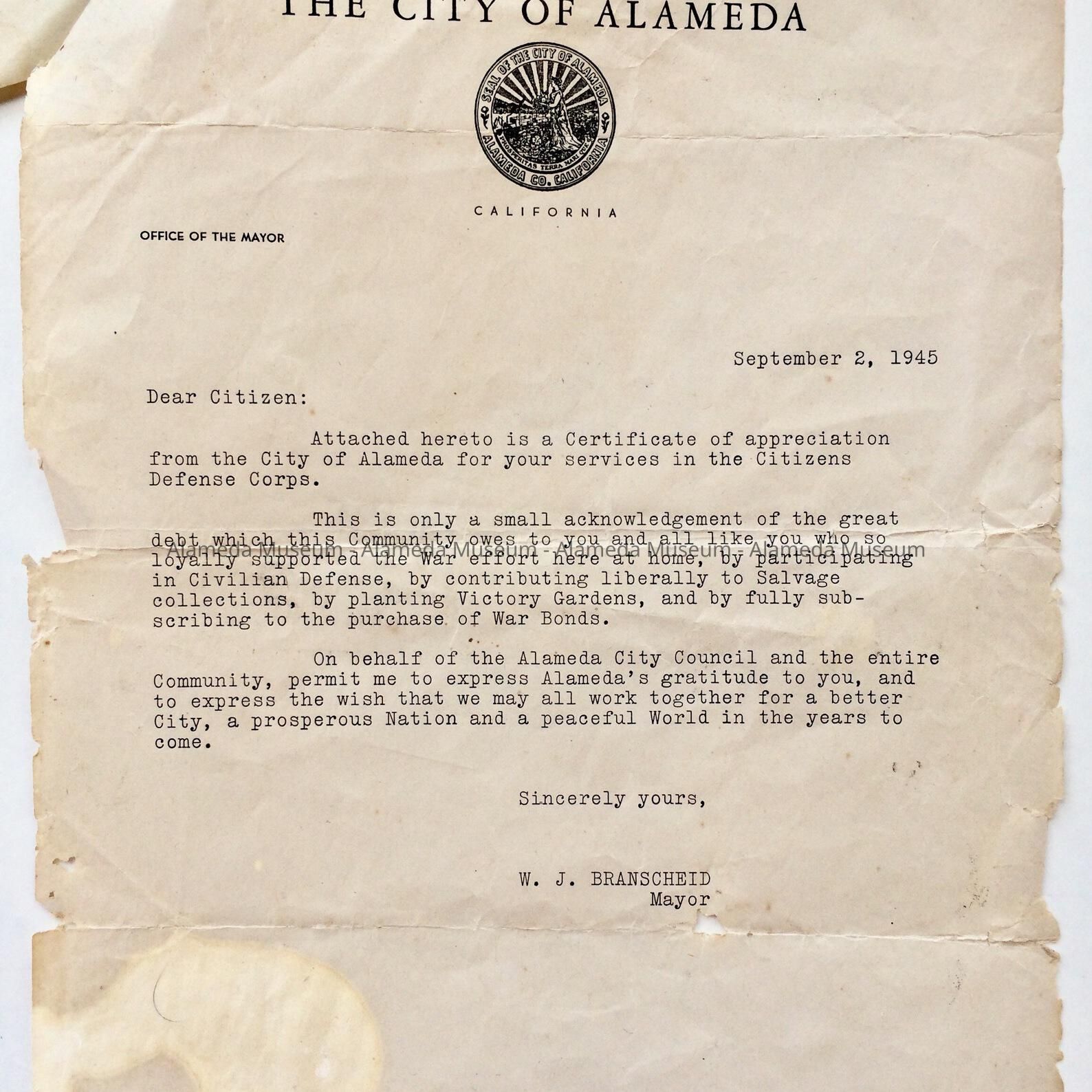 A CERTIFICATE WITH BOLD-PRINTED CAPTION, "THE CITY OF ALAMEDA," AND A LETTER WITH AN IDENTICAL CAPTION. BOTH DOCUMENTS HAVE THE REPRODUCED SEAL OF THE CITY OF ALAMEDA.