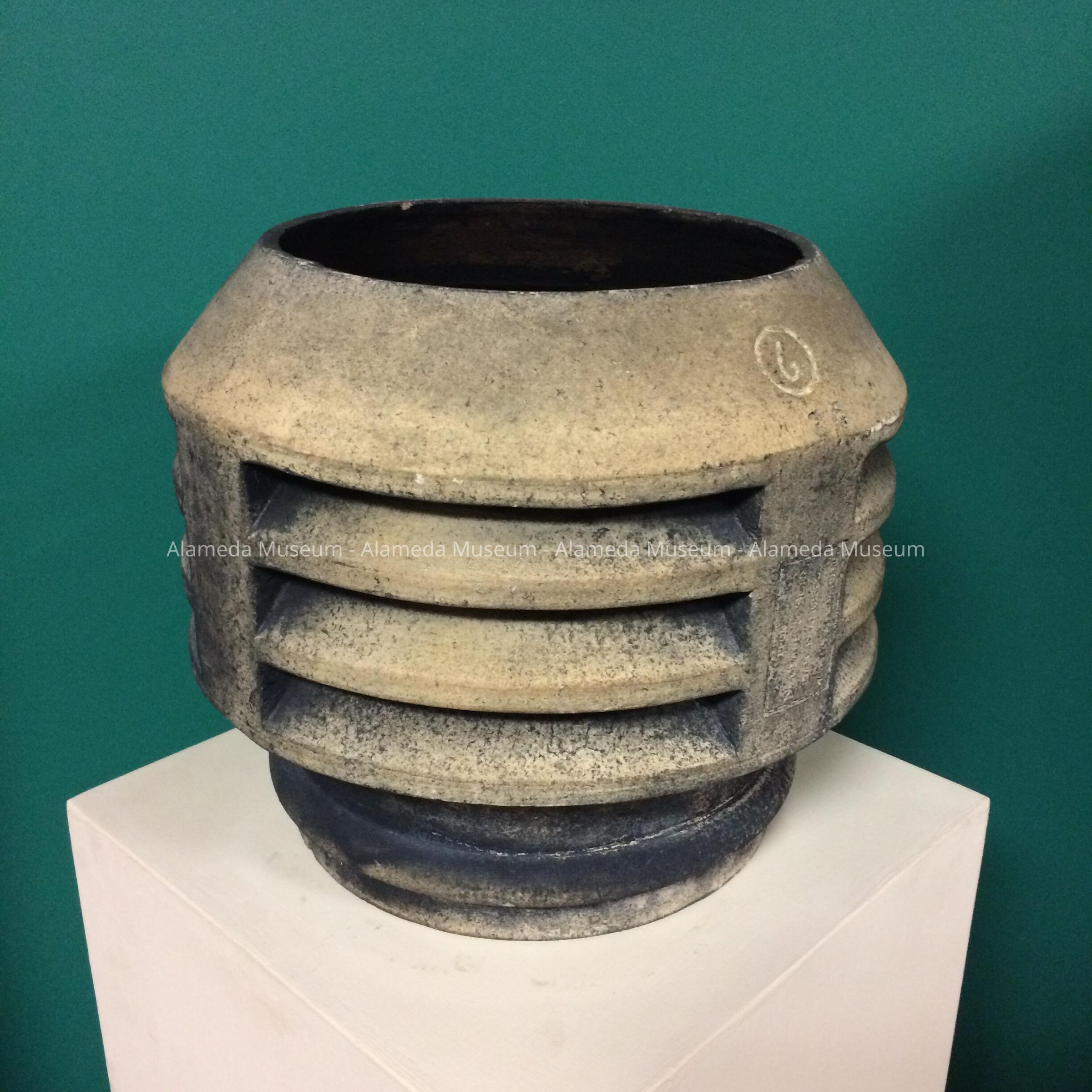Description: Tan, soot-discolored, chimney topper with three horizontal vents. It is also marked with number 34. On one of the sides can be made out a stamp, stating 'N. Clark & Sons, San Francisco - Works at Alameda, Calif.’