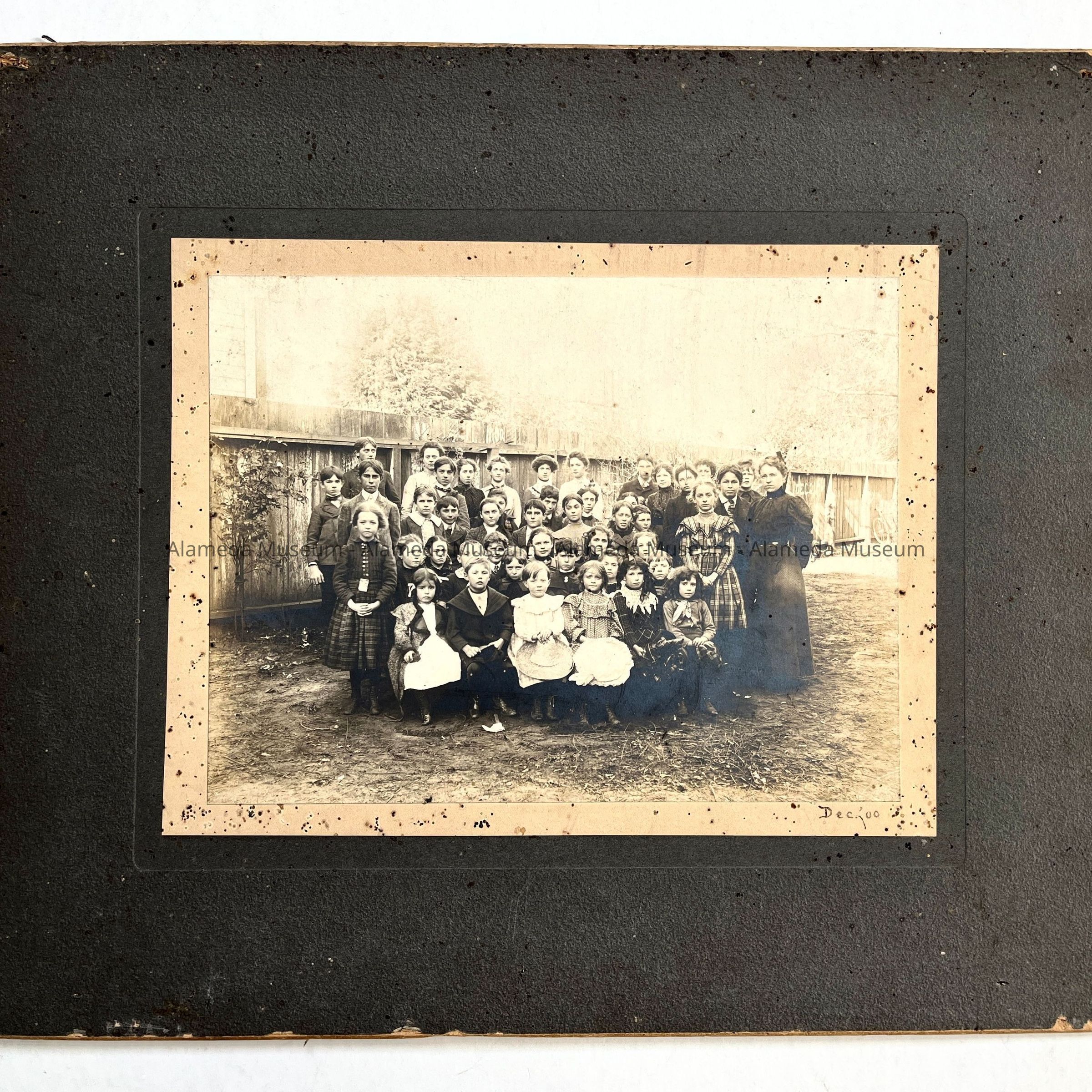 History of Object: Photo of Miss. Charlotte Deas, primary & grammar school, 1729 San Antonio avenue, Alameda. Ms. Deas standing in rear row (second from left). Students identified as, Harper Lubbock (2nd left front row) Milward Deas Miller (3rd left front row) Alston Deas (second row, right end) Ruth Deas (Mrs. Wm.) right end back row, Leta Mc Cartney (standing right next to Ruth Deas), Roberta Haslett, standing left. The School was located in a building in the back yard of the Deas residence. The picture is dated, Dec, 1900.