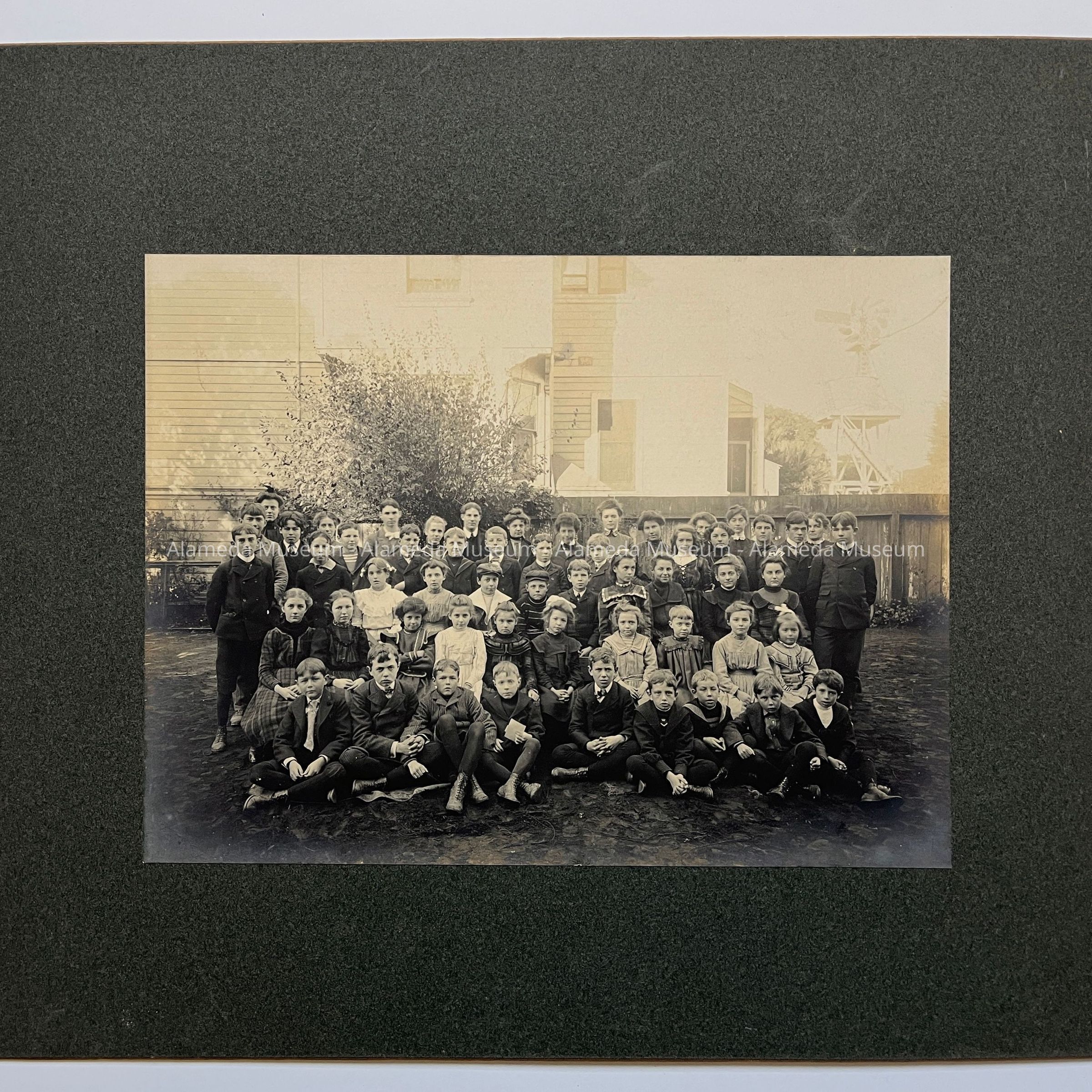 History of Object: Class photo of Deas Private School, 1700 block San Antonio Avenue, Alameda, California. It was founded and operated by Miss. Charlotte Deas, in her family home. One of the children identified in the photo,