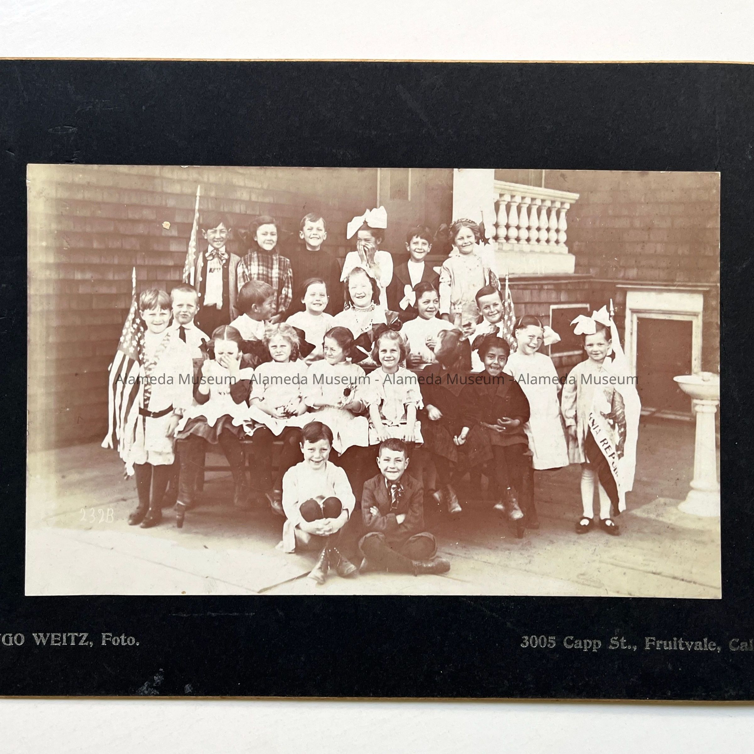 Description: Sepia tinted photo on professional mounting (black), signed in silver type "Hugo Weitz, Foto., 3005 Capp St., Fruitvale, Calif".