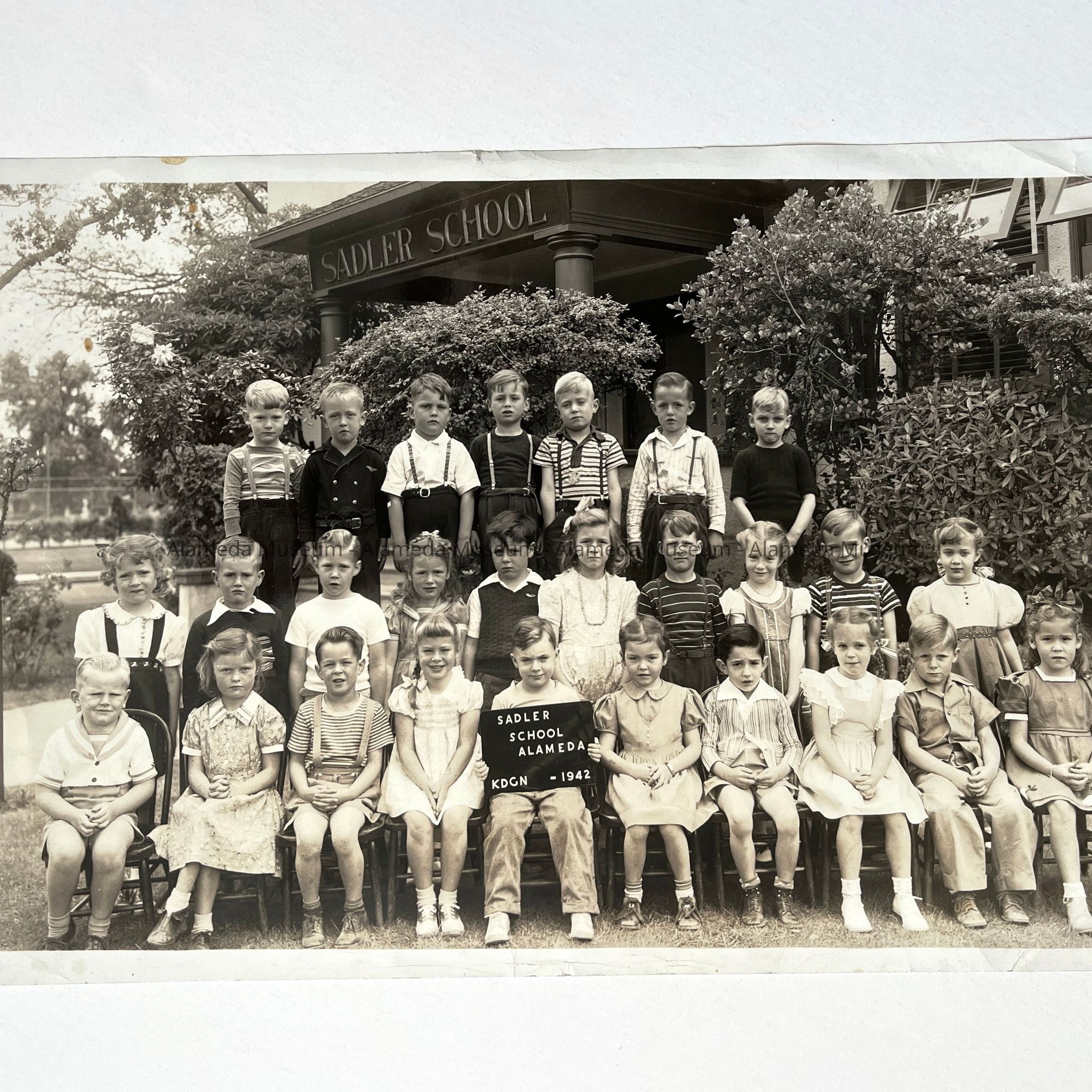 Class photo (kindergarten), Sadler School (now Franklin), dated 1942. On the reverse side is written a list of class members.