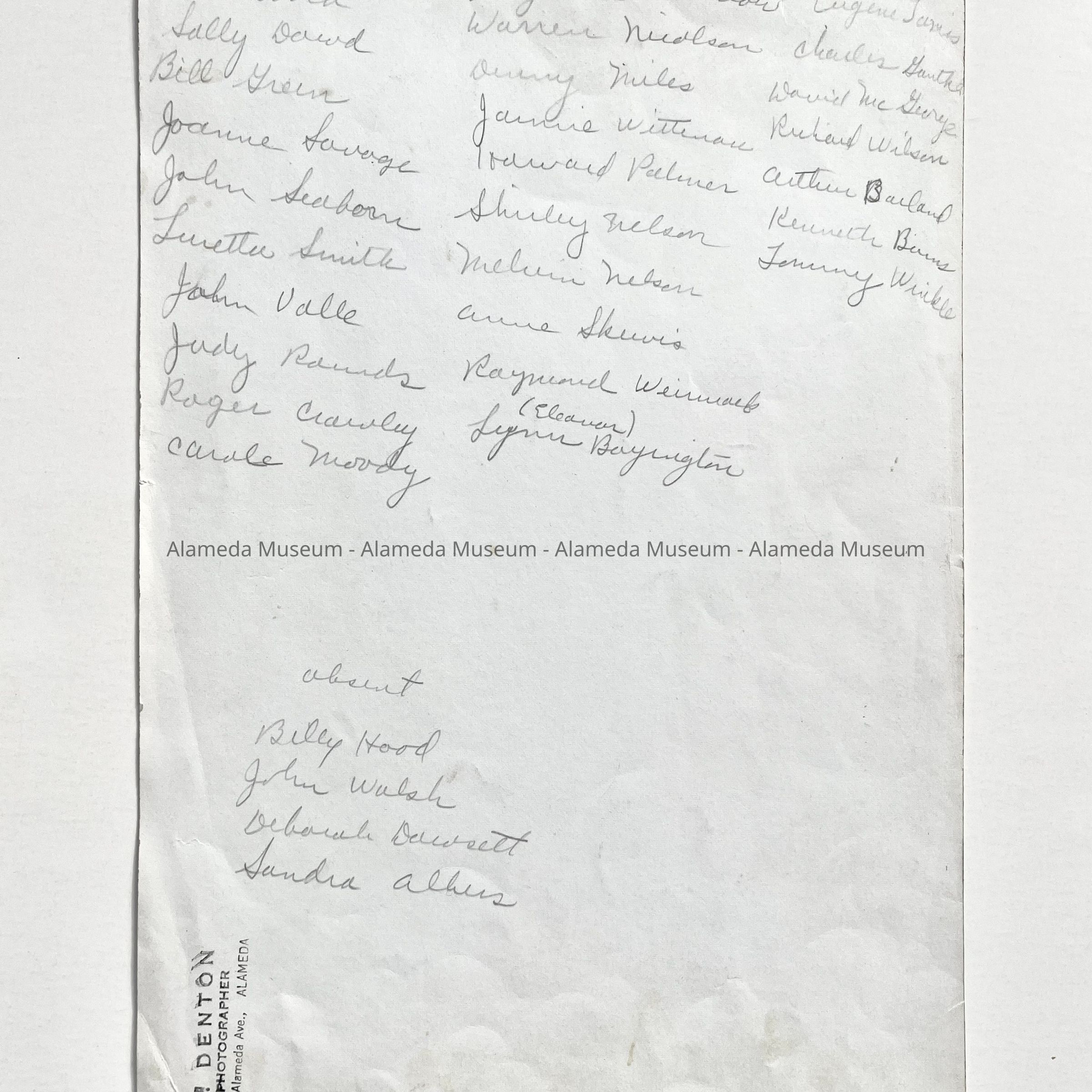Description: Black & white glossy photo, signed on the reverse side "S. Denton, photographer, 2106 Alameda Ave."