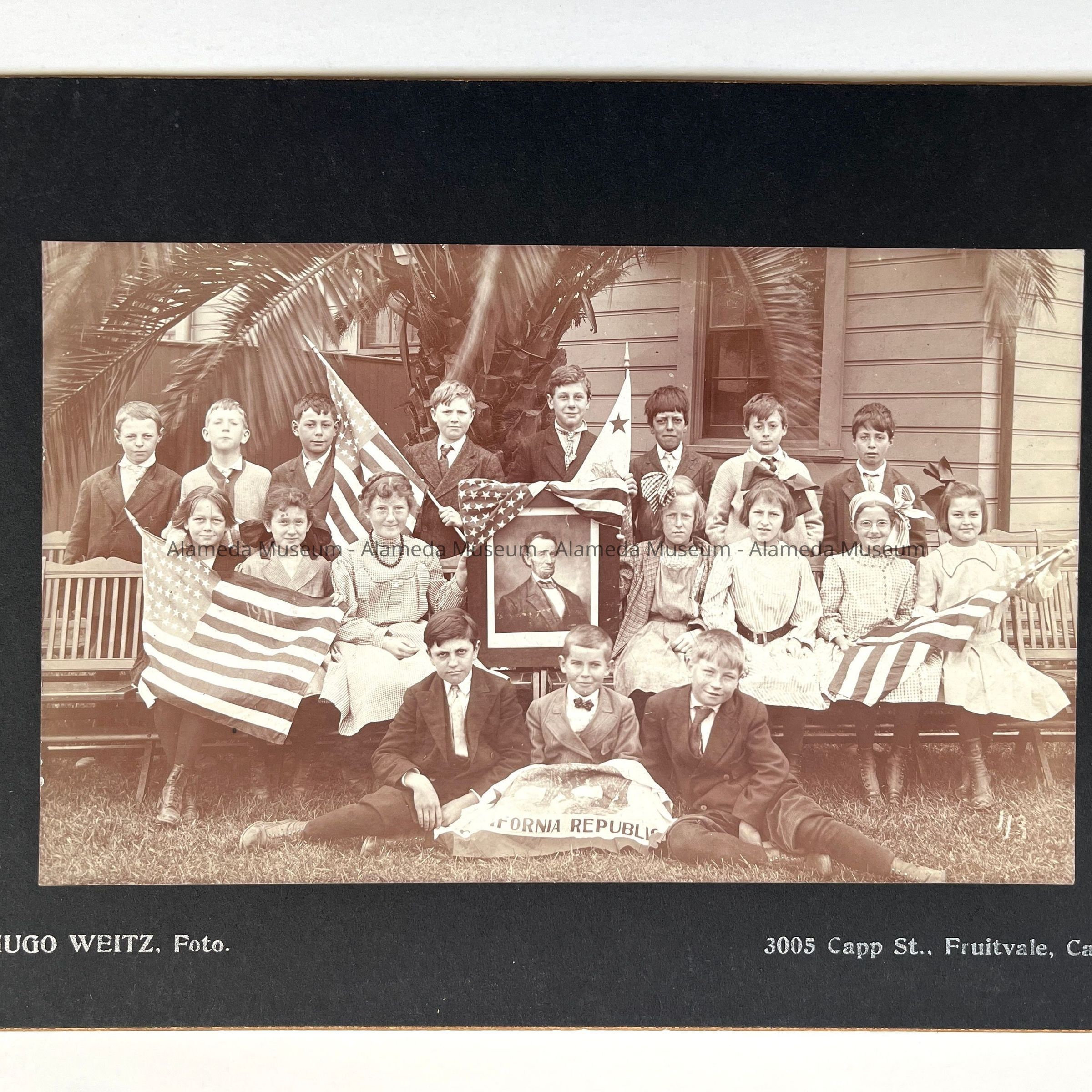 GROUP OF CHILDREN HOLDING PORTRAIT OF LINCOLN AND AMERICAN FLAGS. Wm. NANKERVIS PICTURED AMONG GROUP