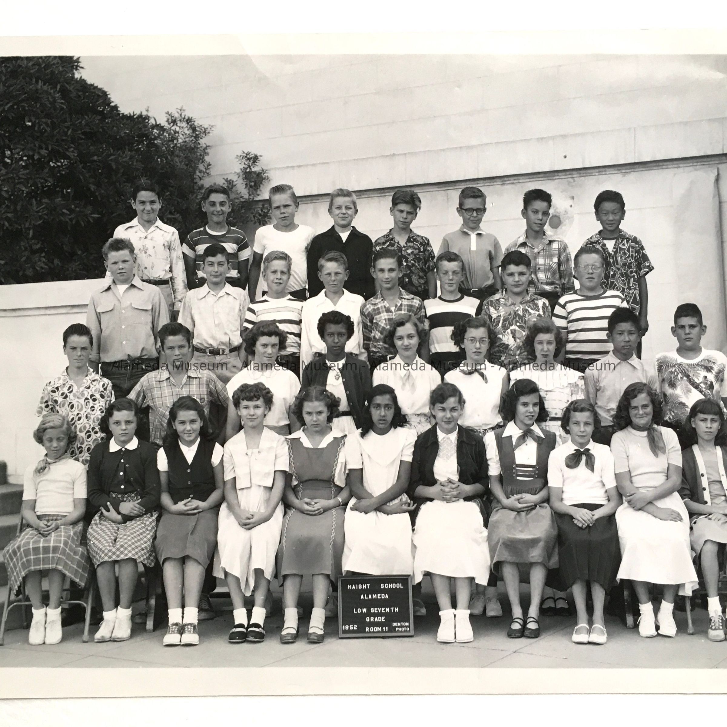 History of Object: Class Photo of Haight School, Alameda, Low Seventh Grade, Room 11, 1952. The Donor was part of the class. As a theory, this may have been the source photo for copies to be made for the names on the reverse.
