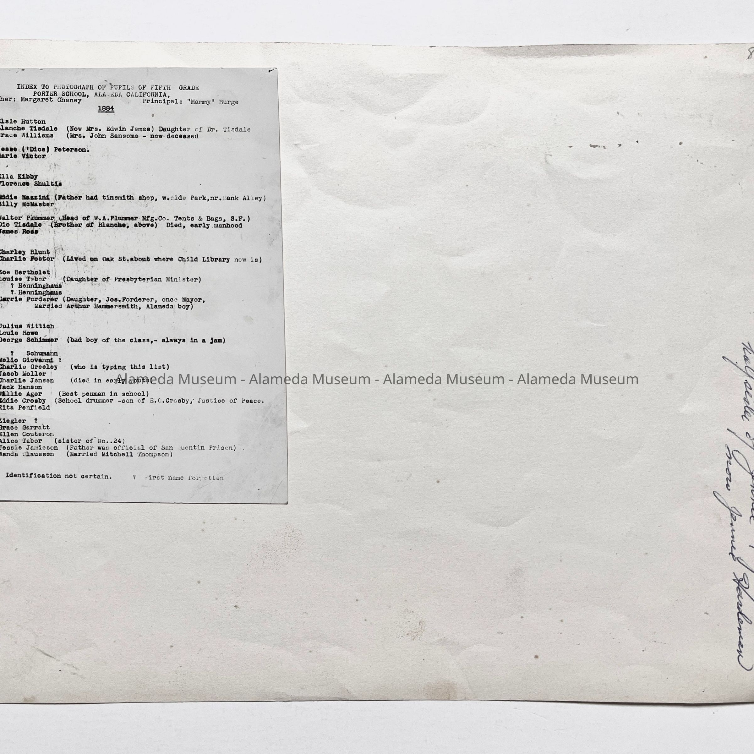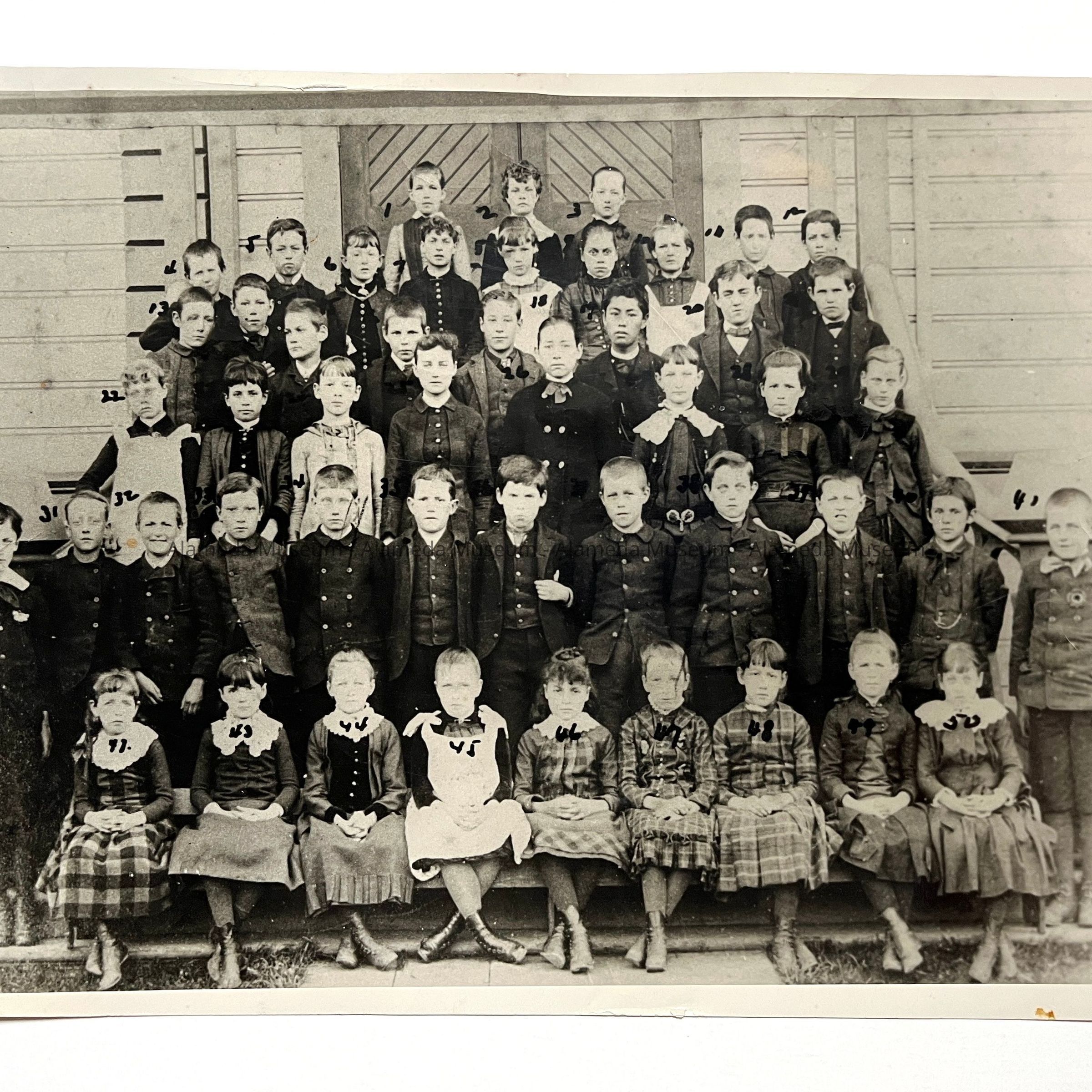 History of Object: Reproduction photograph of pupils of the fifth grade, Porter School, Alameda, Ca., teacher Margaret Cheney, 1884. On the reverse side is an index of pupils, number 10 being Florence, daughter of Edward Shultis, a pioneer house painter of Alameda, and Aunt of the donor.