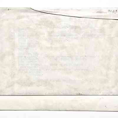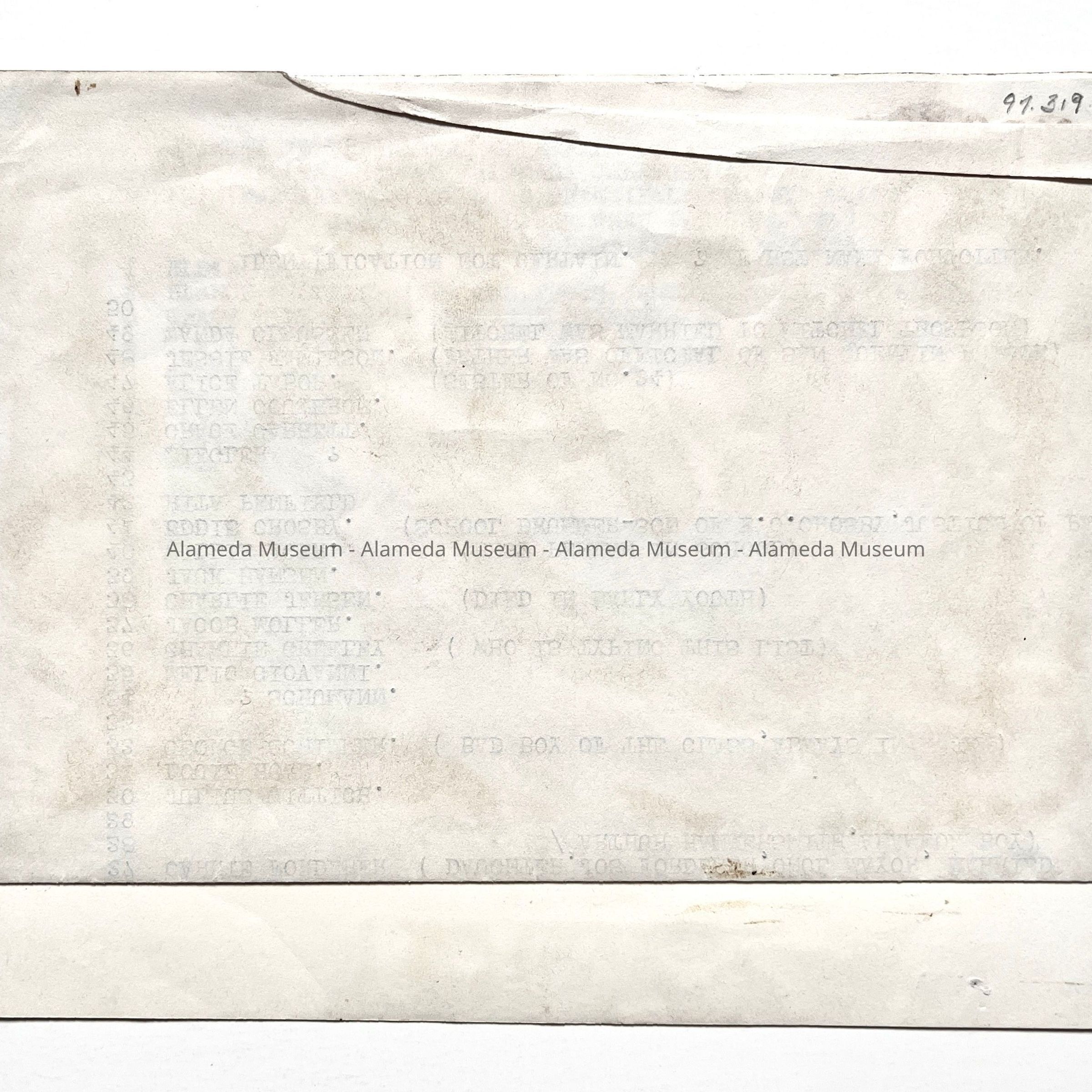 Description: Black/white glossy photocopy of a vintage image, unmounted. Original photographer unknown. Image has an old green cataloging label affixed to its upper left corner and a white description label glued along its bottom edge. A letter sized sheet of paper with typewritten description material is glued to the verso (with the unglued half folded over).