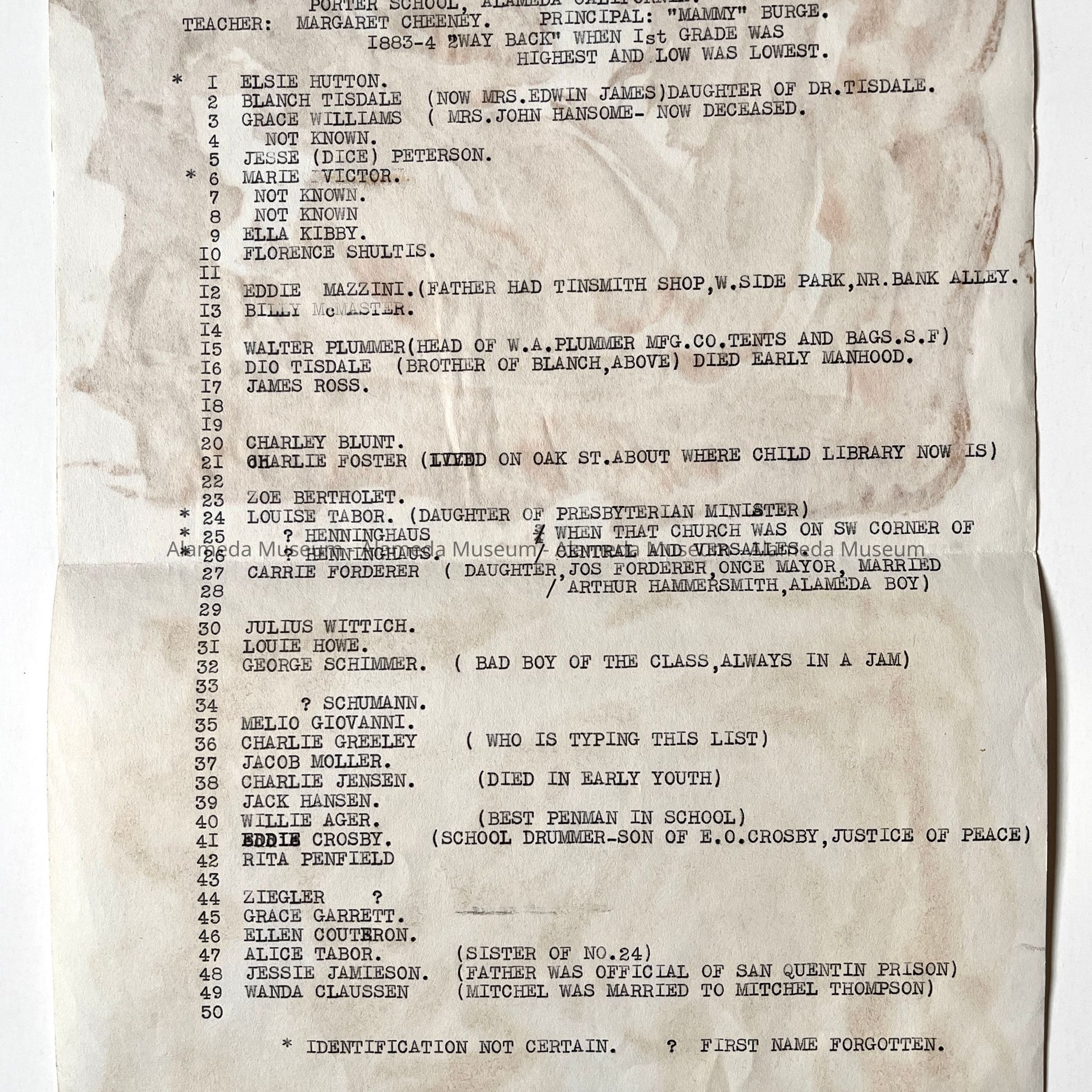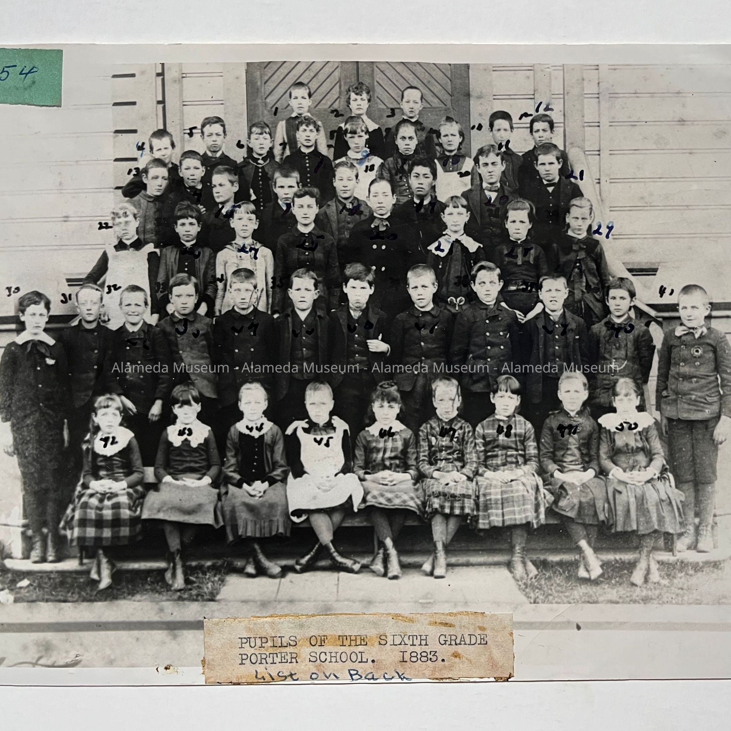 History of Object: Pupils of the Sixth Grade, Porter School, 1893, posed on the front steps. Most pupils are identified on a list attached to the verso.