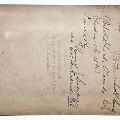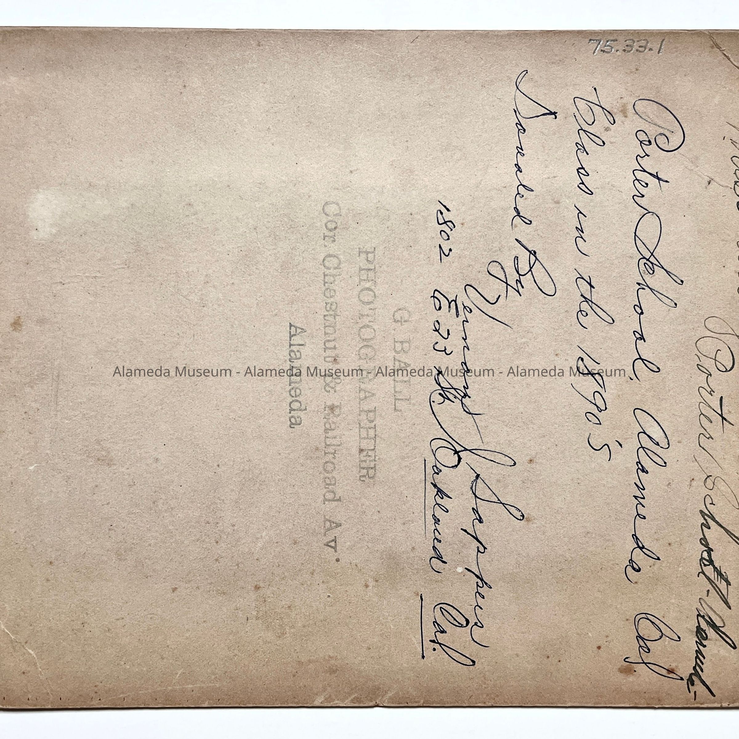 BELOW, PROBABLY PRINTED WITH A RUBBER STAMP, IS THE PHOTOGRAPHER'S NAME, G. BALL, PHOTOGRAPHER, COR. CHESTNUT & RAILROAD AVE, ALAMEDA. THE PHOTOGRAPH IS NOT DATED, BUT A STUDY OF THE CLOTHING STYLES PLACES IT IN THE 1880's.