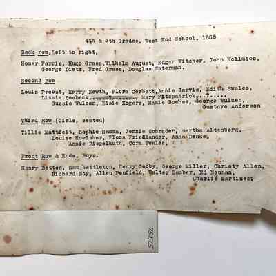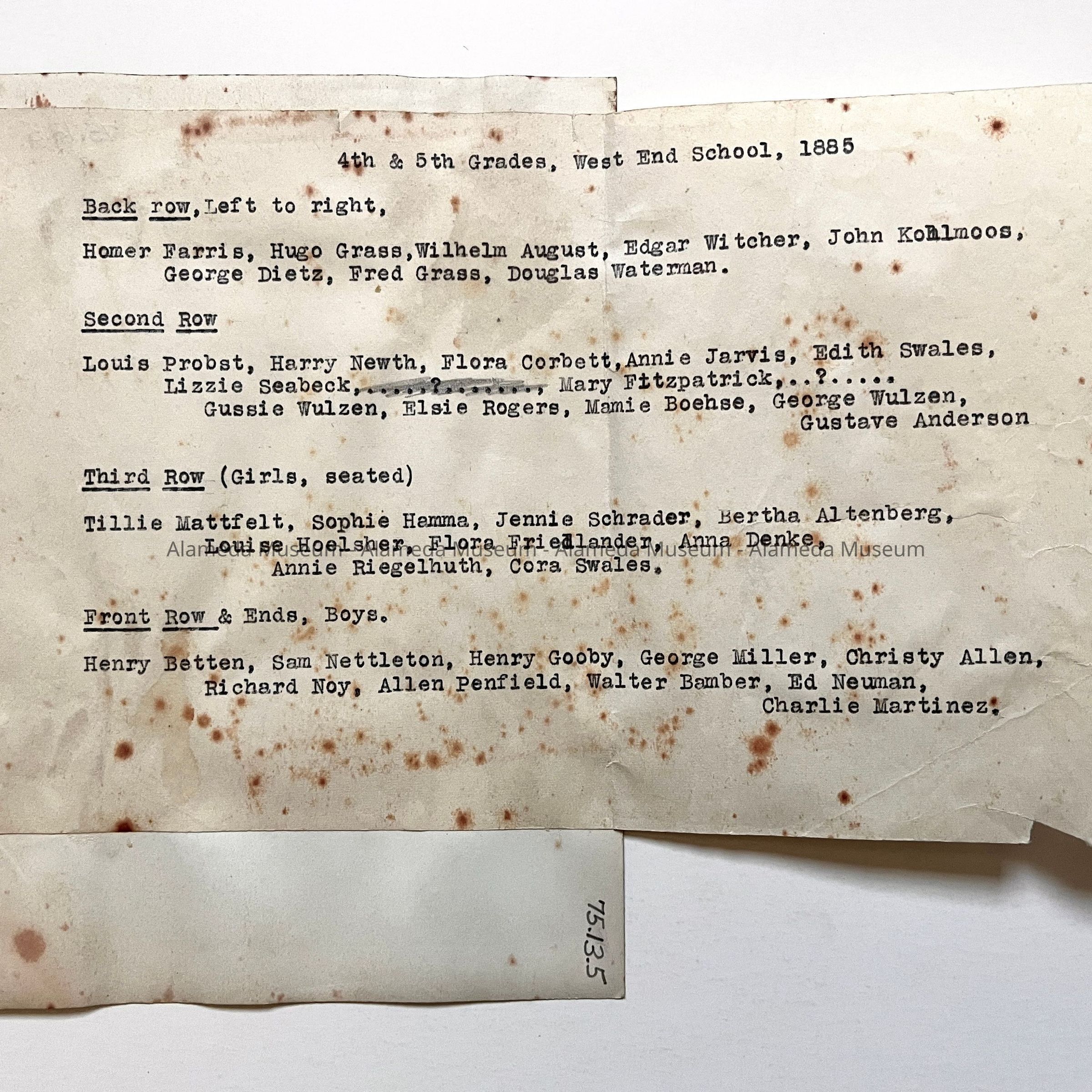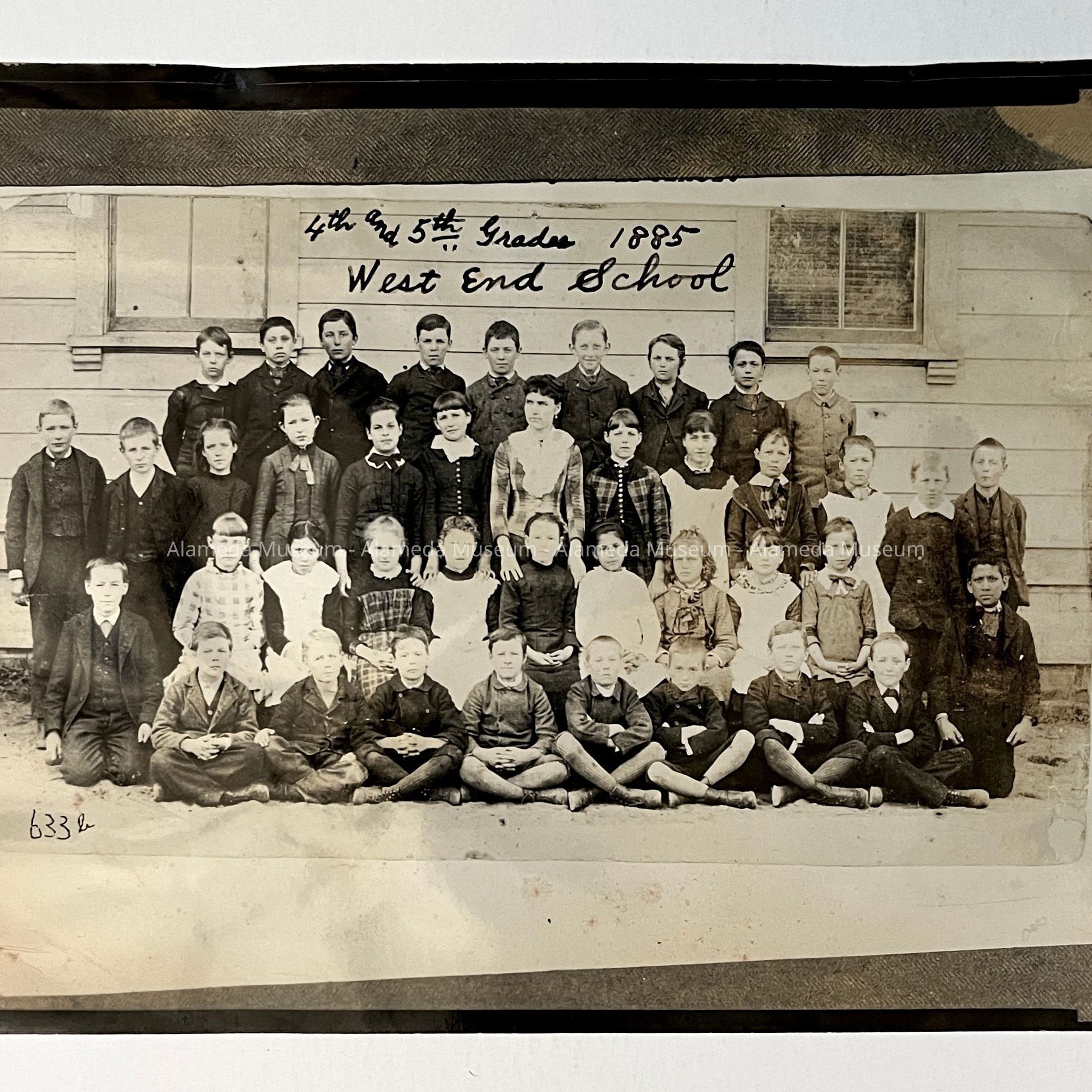 HISTORY OF OBJECT: CLASS PICTURE OF LONGFELLOW SCHOOL, KNOWN AS THE WEST END SCHOOL, BEFORE 1895. THE PICTURE IS DATED 1885. AND CONSISTS OF THE MEMBERS OF THE 4th AND 5th GRADE. AMONG THE CLASS MEMBERS IS GEORGE WULZEN. BORN IN ALAMEDA, MAY 28, 1873. IT WAS MR. WULZEN WHO CREATED THE MODEL TRAIN ON DISPLAY IN THE HISTORICAL SOCIETY MUSEUM. IN HONOR OF HIS TWIN SONS, BORN IN 1899. IT IS A REPLICA OF THE NARROW GAUGE RAILROAD ENGINE THAT RAN ON ENCINAL AVENUE, FROM ALAMEDA TO SANTA CRUZ.
