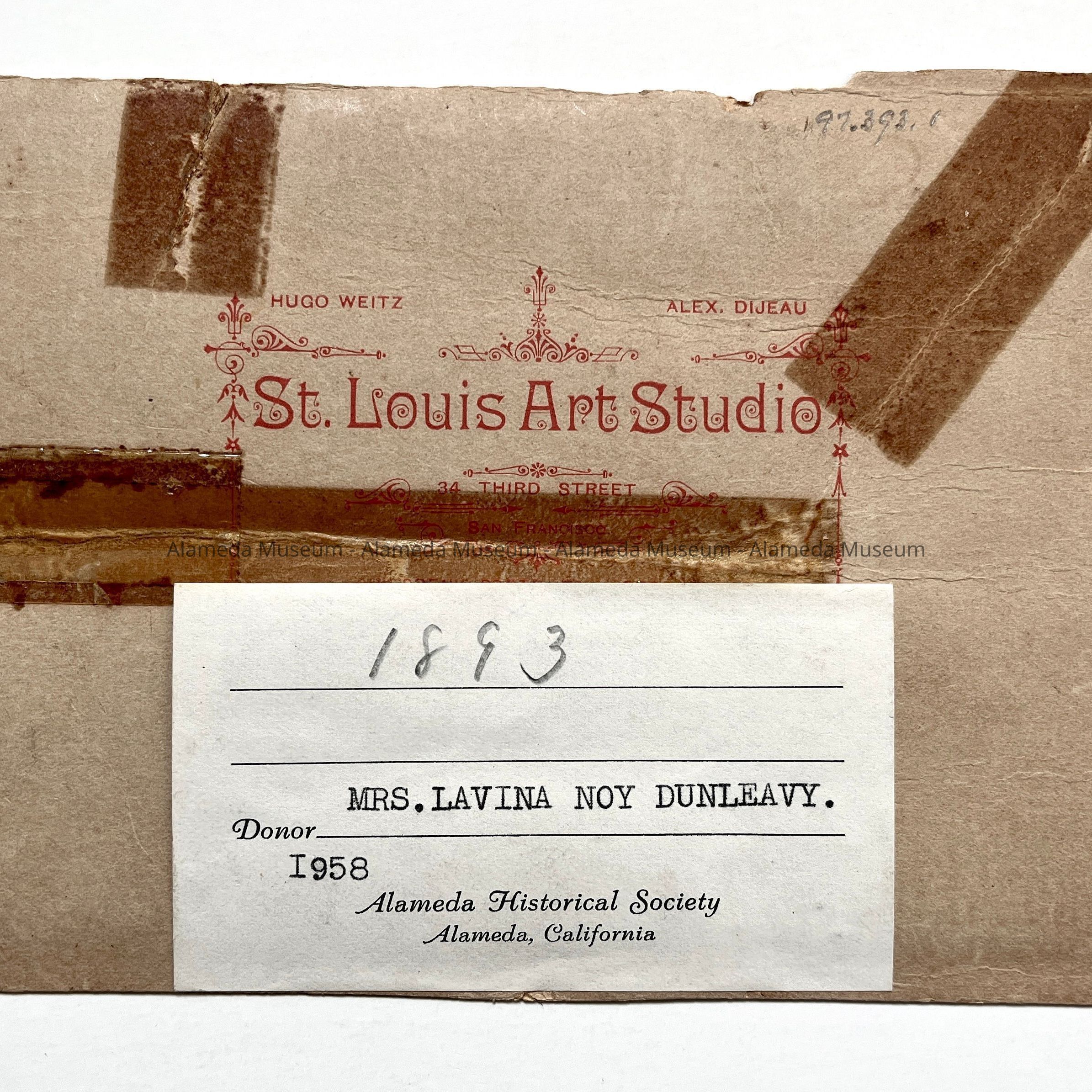 Description: Sepia-toned albumen print photo mounted on tan paperboard with an imprinted dull red border. Photographer: St. Louis Art Studio (Hugo Weitz), S.F. The image is damaged by broken corners, a horizontal crease, a vertical tear, and an old green cataloging label glued to the upper left corner.