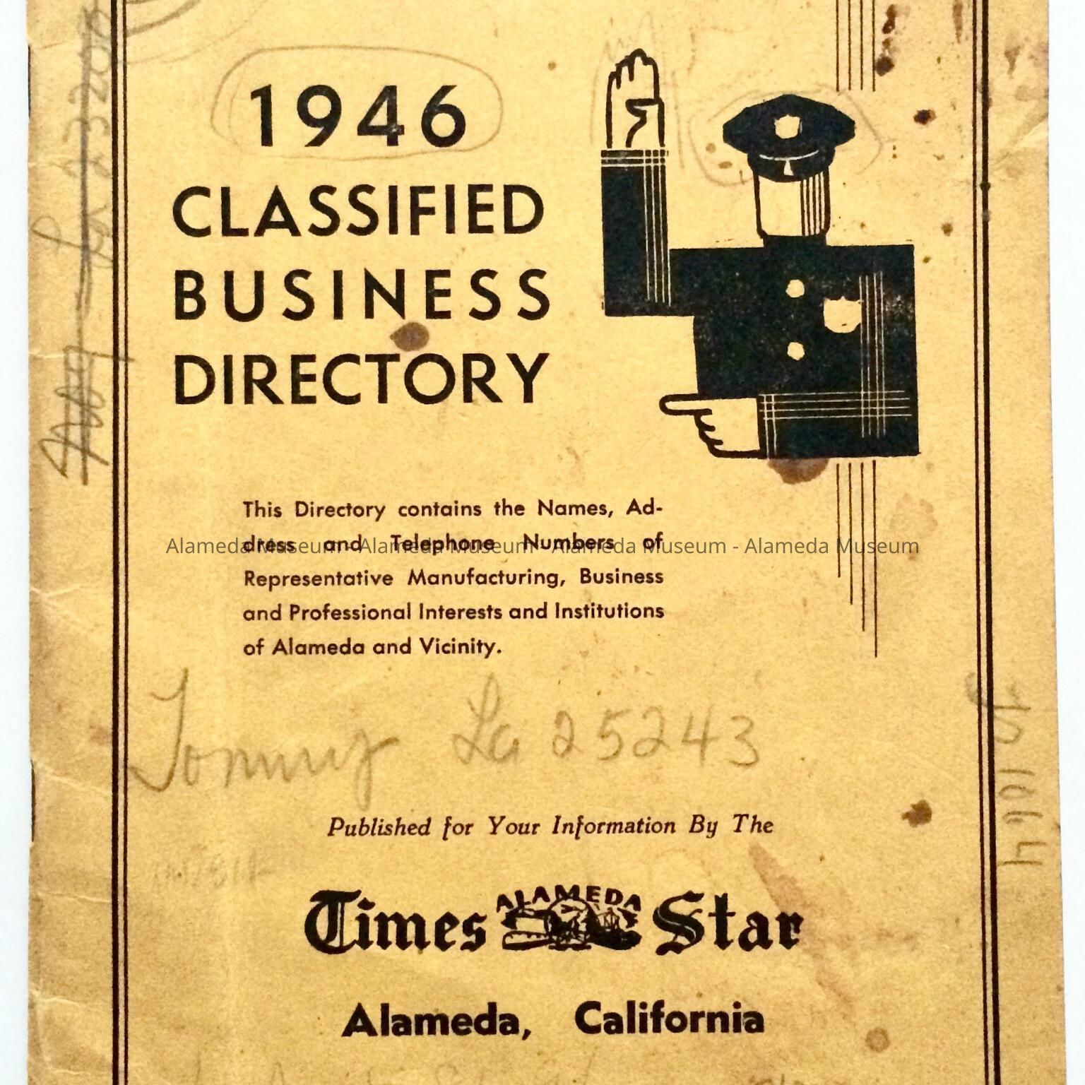 HISTORY OF OBJECT: CLASSIFIED BUSINESS DIRECTORY FOR 1946, PUBLISHED BY THE ALAMEDA TIMES STAR. THE DIRECTORY ALSO INCLUDES A HISTORY OF THE TIMES STAR NEWSPAPER AND A BRIEF HISTORY OF THE COMMUNITY.