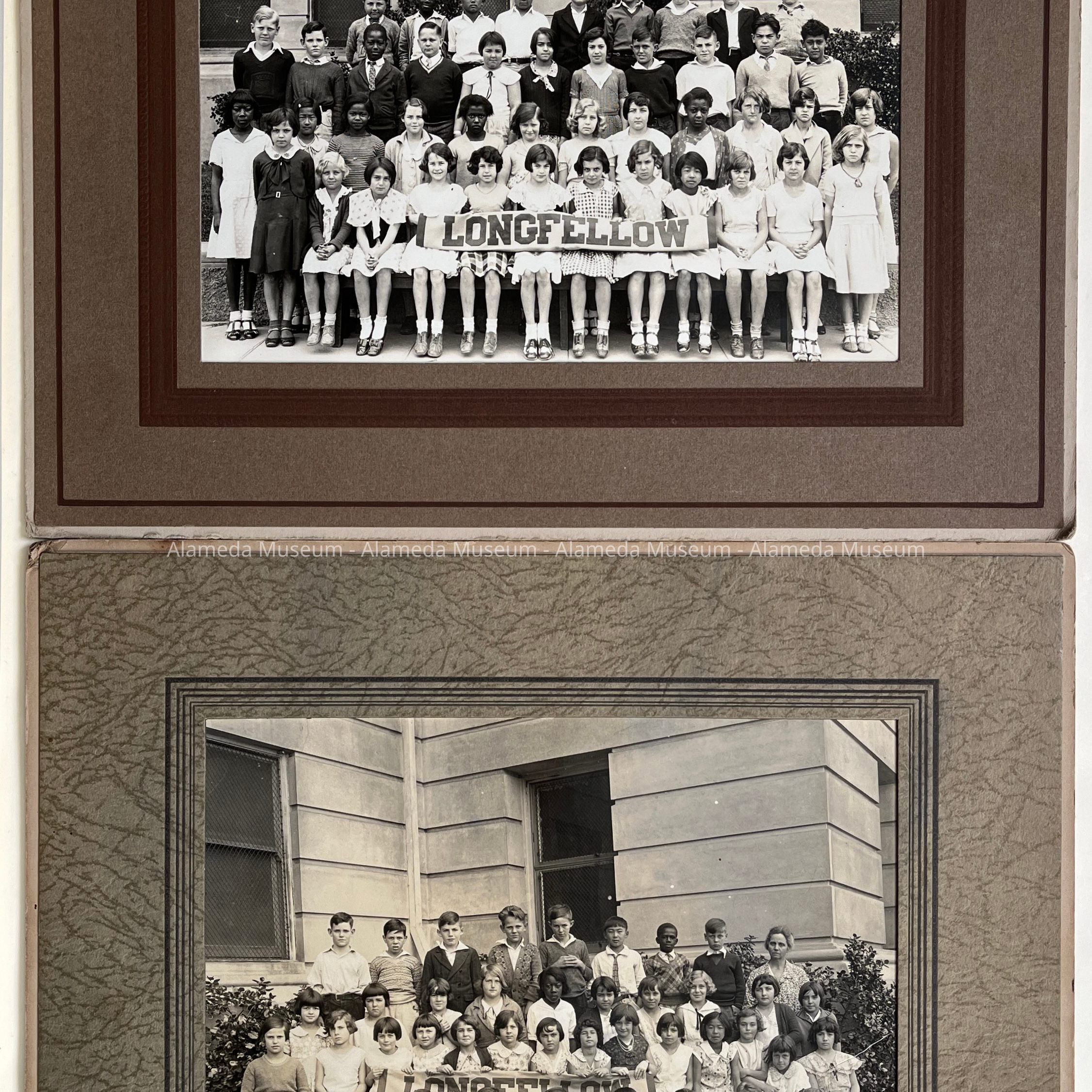Description: 2 sepia tinted photographs in tan cardboard frames or matts, showing a group of children posed in rows in front of a building. Some of the children are holding a banner stating ’Longfellow’. B also has one woman.