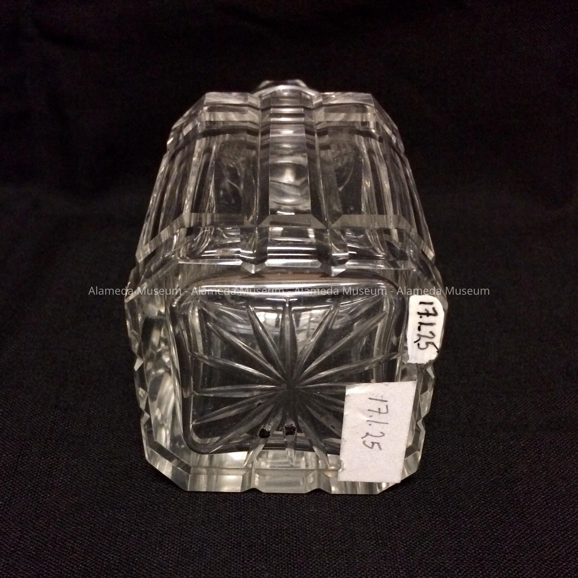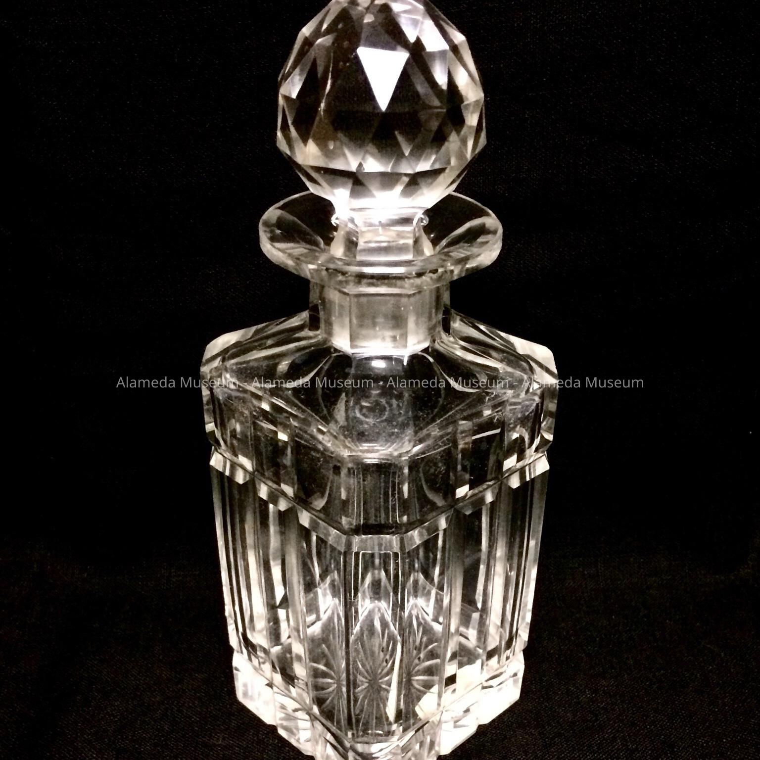 Description; A clear crystal four sided bottle with a stopper. It has a protruding opening that supports a faceted crystal stopper. The pattern on the bottle has indentations forming cubes that terminate at the base. Maker unknown, but possibly of American manufacture.