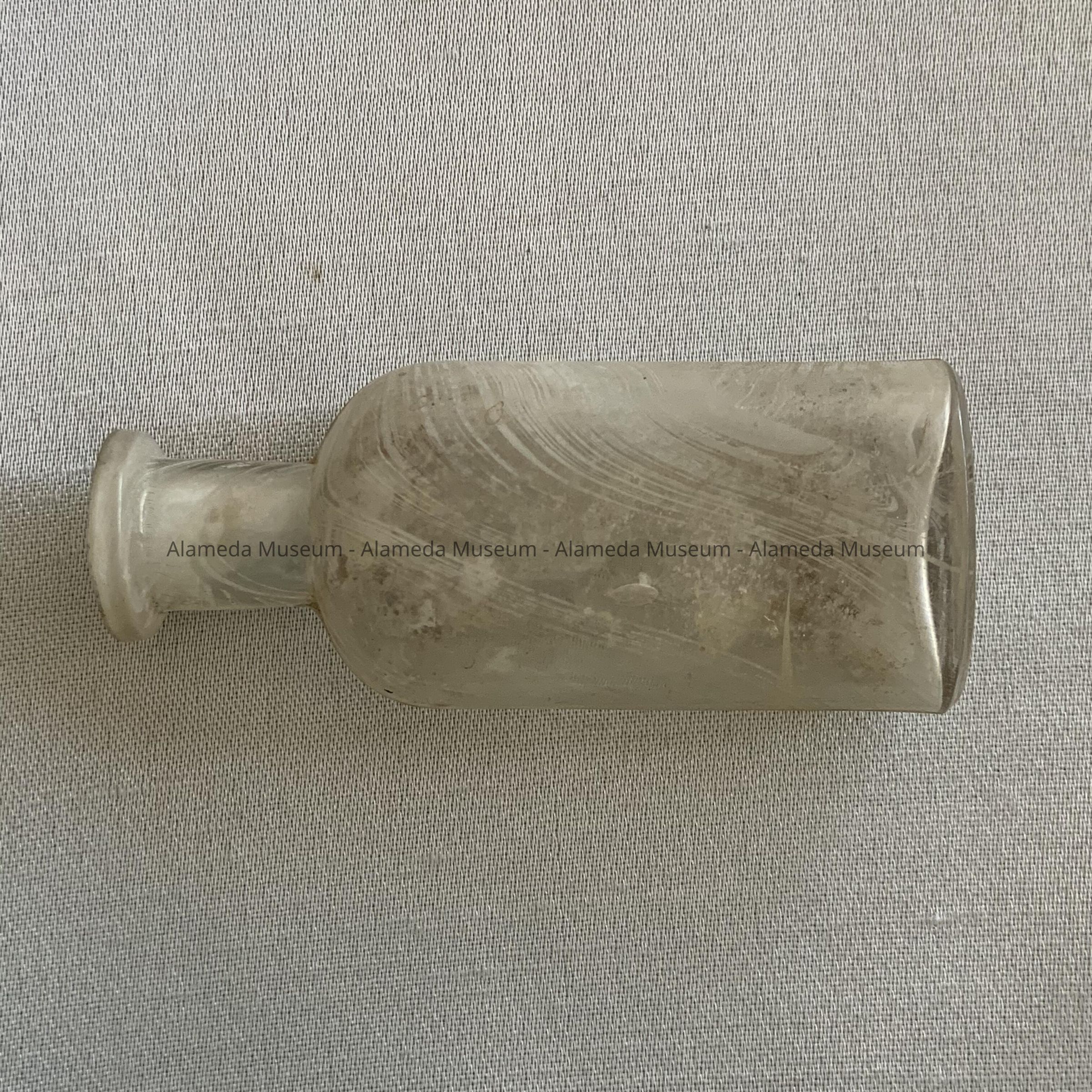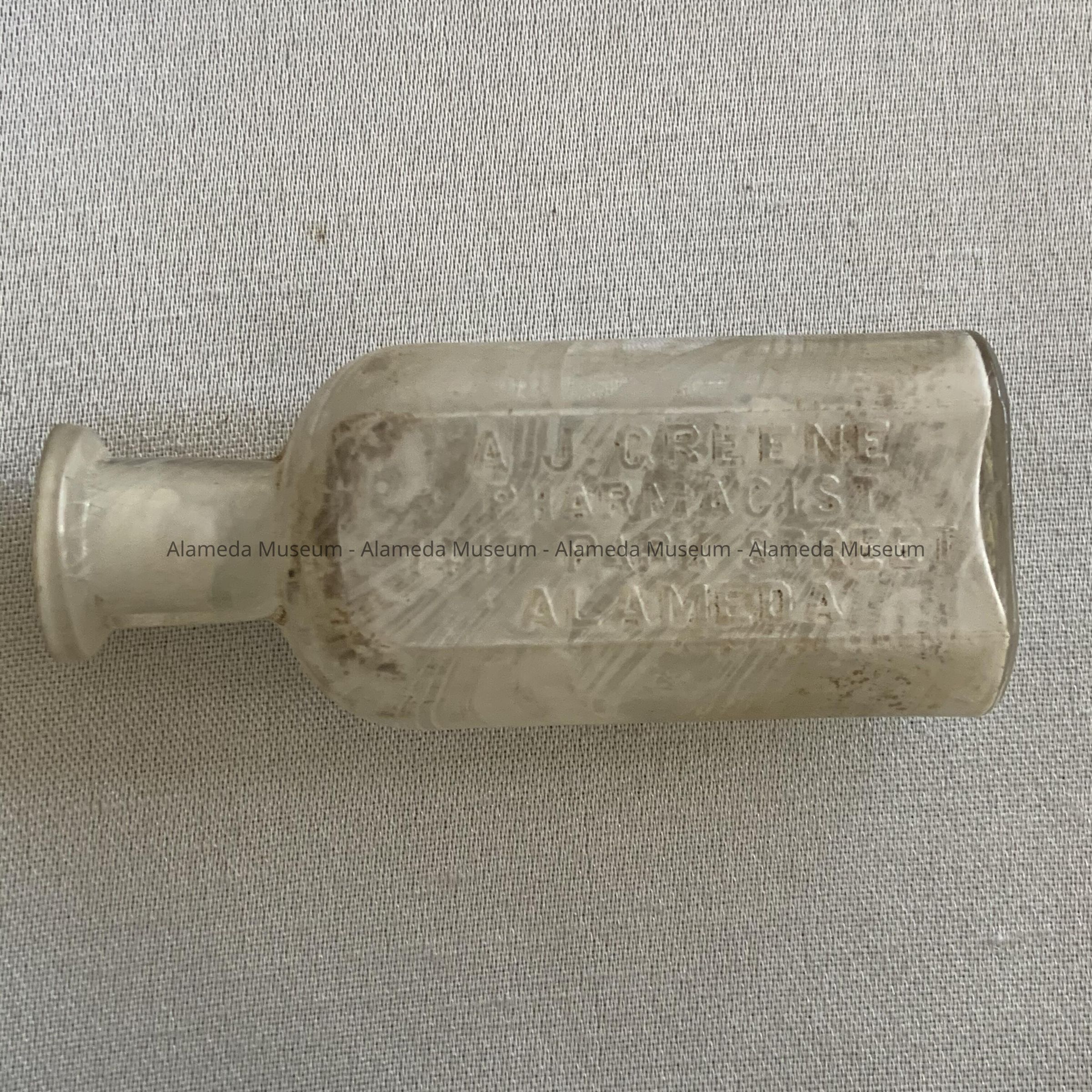 MEDICINAL BOTTLE, CLEAR GLASS, WITH EMBOSSED LETTERING, "A J GREENE, PHARMACISTS, 1417 PARK STREET, ALAMEDA, CALIF." THE BOTTLE, WHICH HAS DOUBLE SEAMS, INDICATING THAT IT WAS MANUFACTURED IN A MOLD, IS IRIDESCENT AND ETCHED BY BEING EXPOSED TO ACIDS IN THE SOIL.