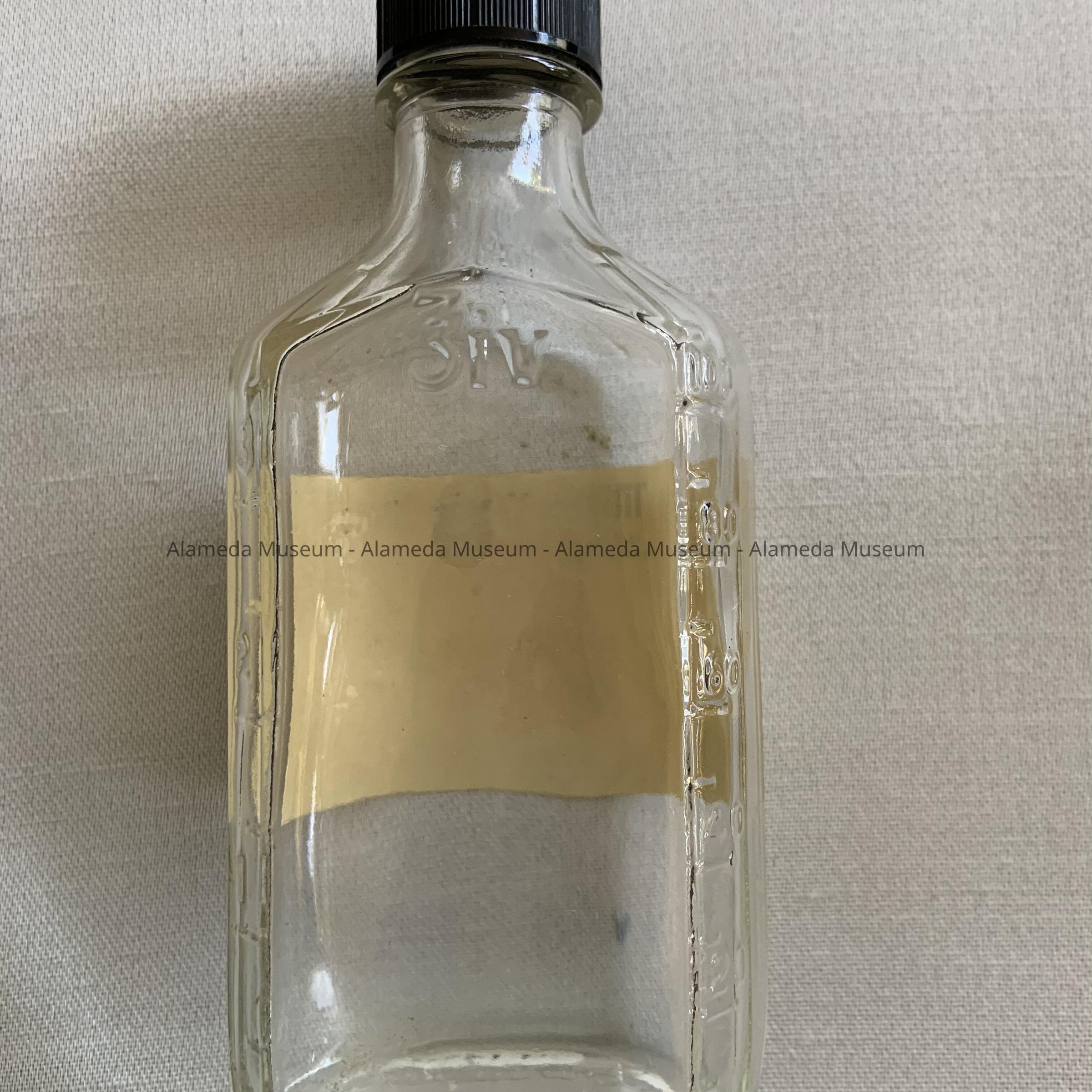 Description: Double seam clear glass bottle with black colored plastic screw top. Bottle has original paper label with bold printed caption, "Miller's Drug Store" in blue colored type on a white colored background.