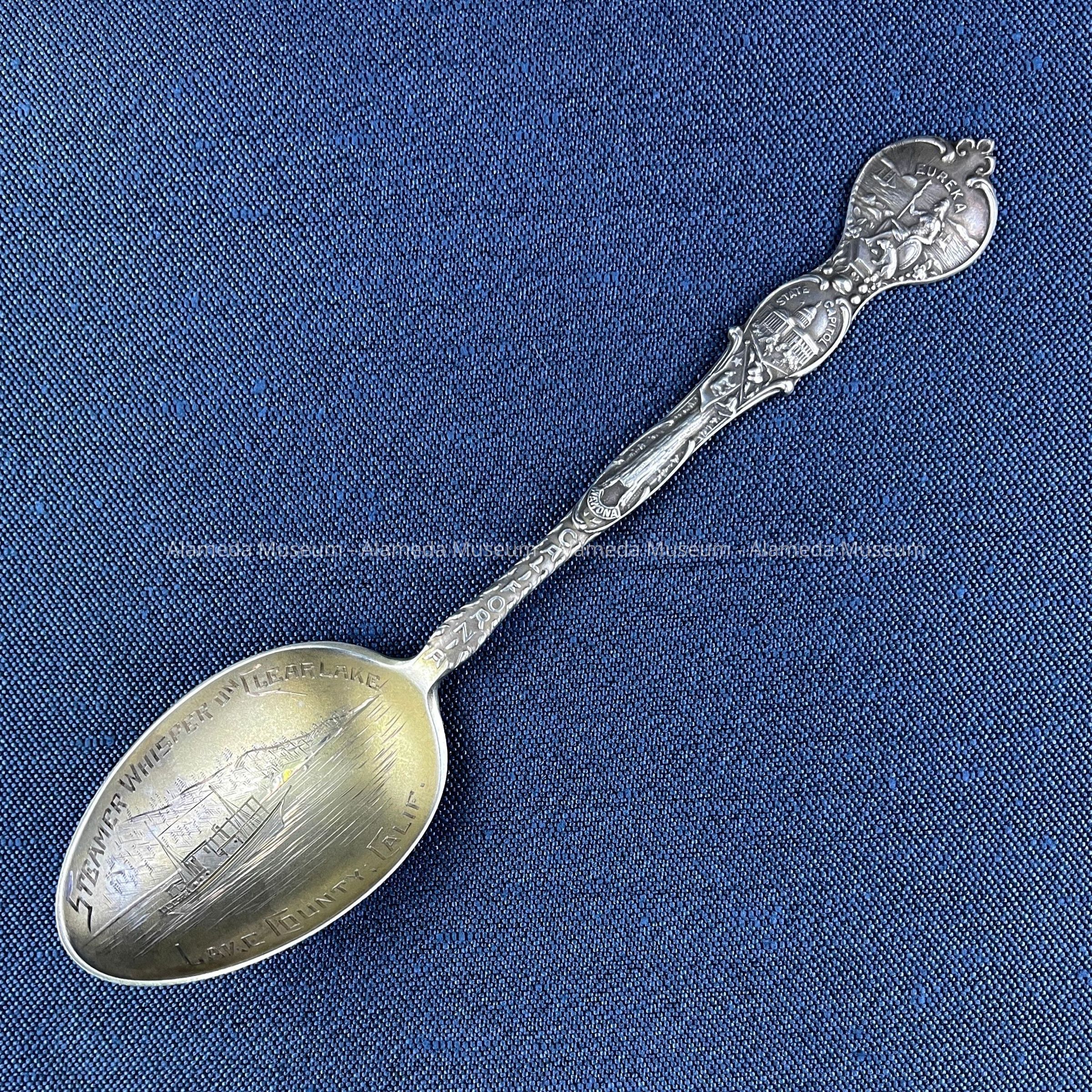 Description: Sterling silver teaspoon with engraved bowl representing the steamer Whisper on Clear Lake, Lake County, Calif. Decorative medallion on handle contains the State Seal (Calif). Size: L-5 1/2 inches.