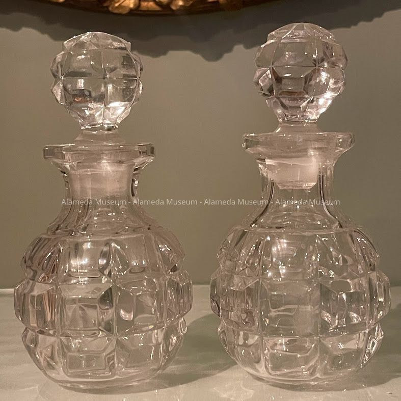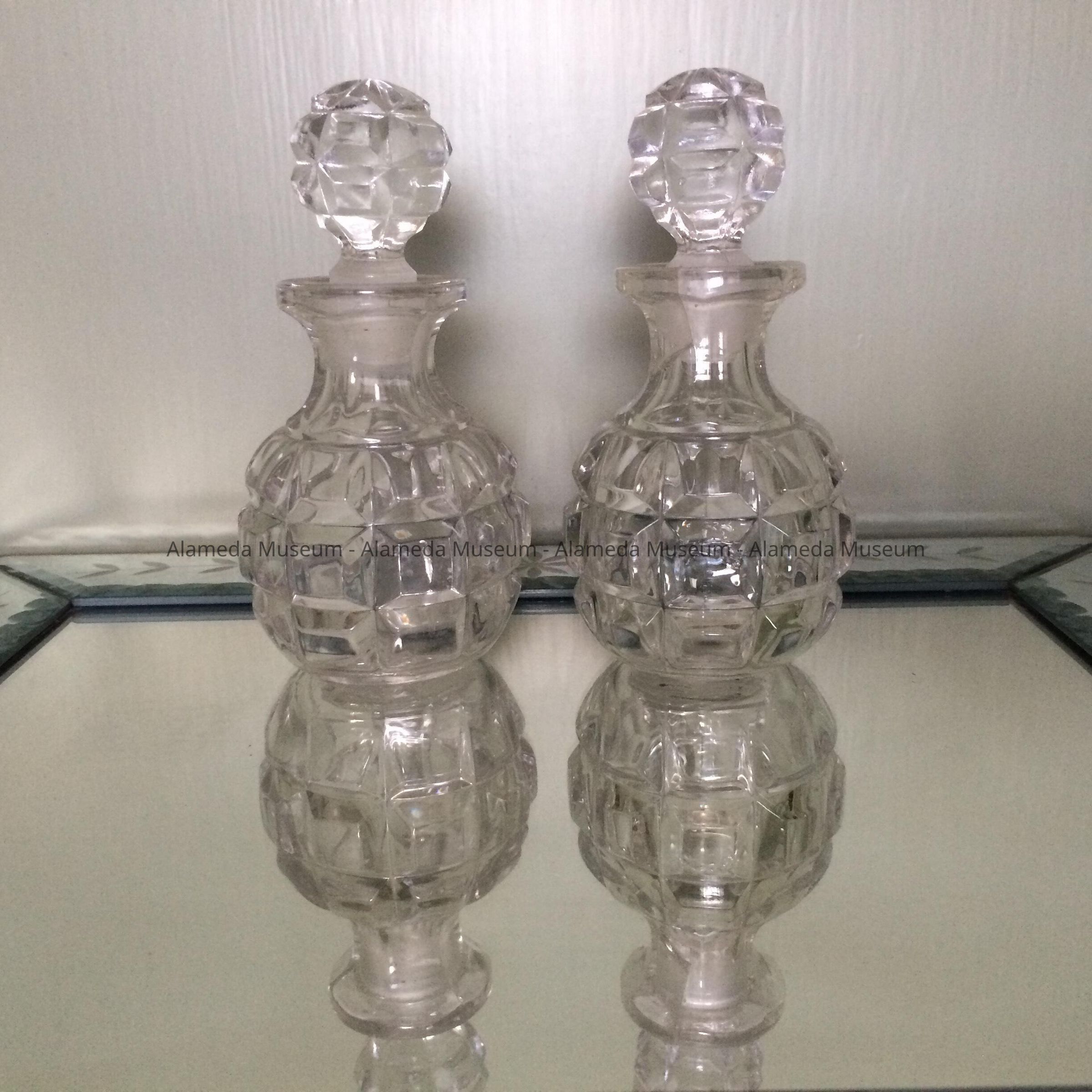 Clear pressed glass stoppered perfume bottles in beveled block pattern, c. 1900Entry/Object ID