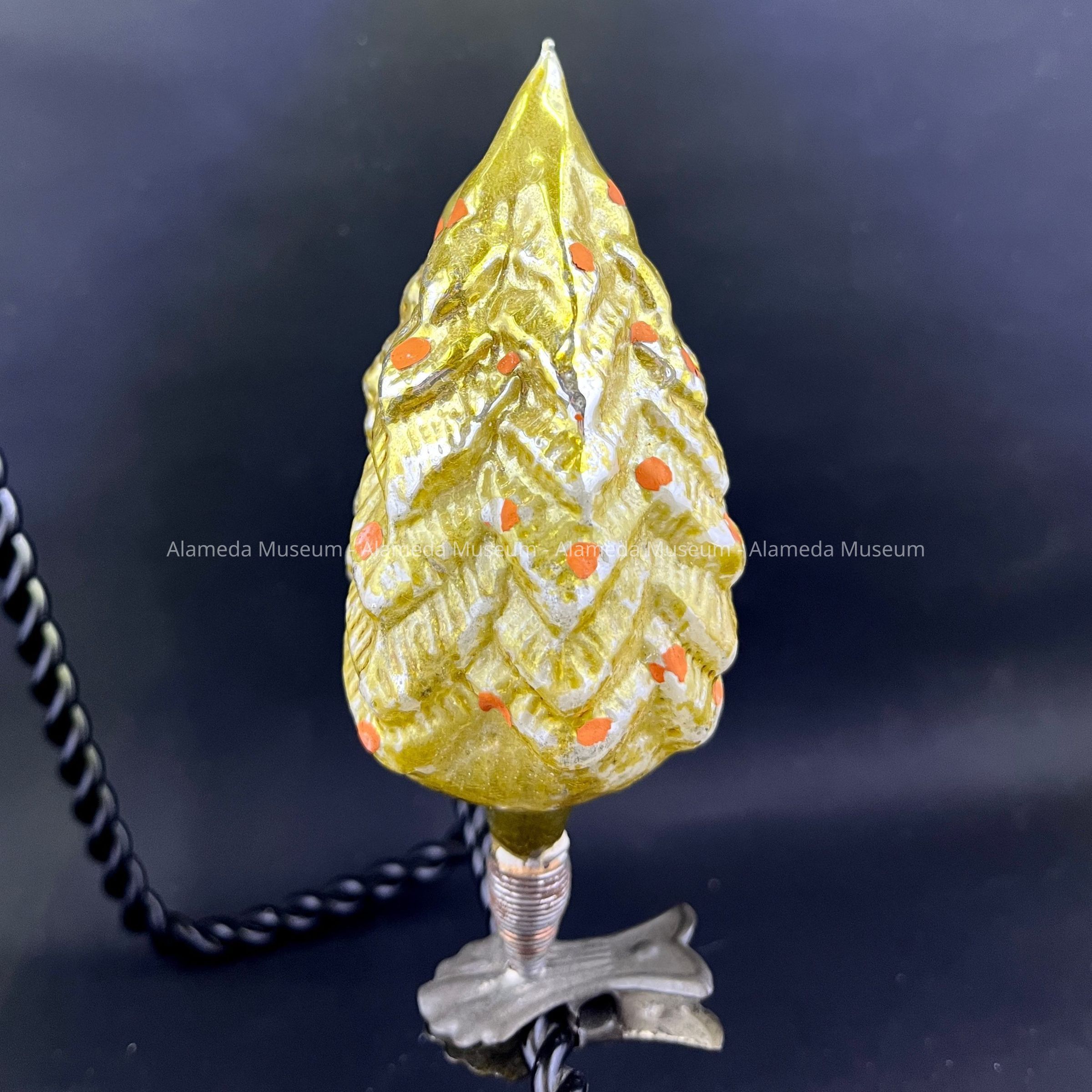 Description: A glass ornament in the shape of a Christmas tree, painted yellow with orange dots. The ornament is mounted on a metal clip with spring.