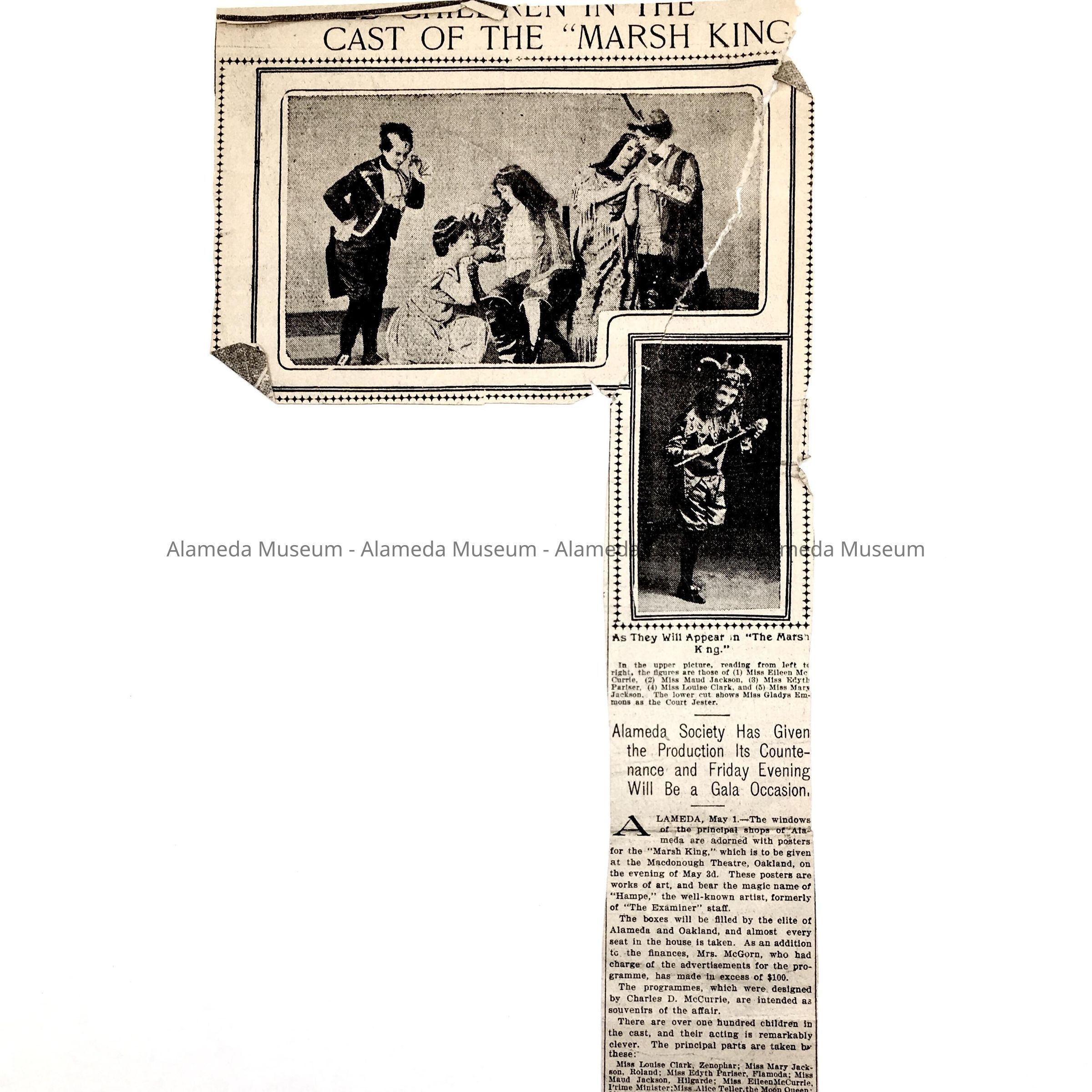 A NEWSPAPER CLIPPING PERTAINING TO THE PRODUCTION OF "THE MARSH KING" OPERETTA WHICH WAS WRITTEN BY CHARLES H MCCURRIE, ALAMEDA RESIDENT AND COMPOSER. THE OPERETTA WAS PERFORMED IN THE MCDONOUGH THEATRE IN OAKLAND ON MAY 3, 1901. OVER 100 CHILDREN PERFORMED IN THE PRODUCTION. IT WAS HELD UNDER THE AUSPICES OF THE ADELPHIAN CLUB FOR CHARITABLE PURPOSES.