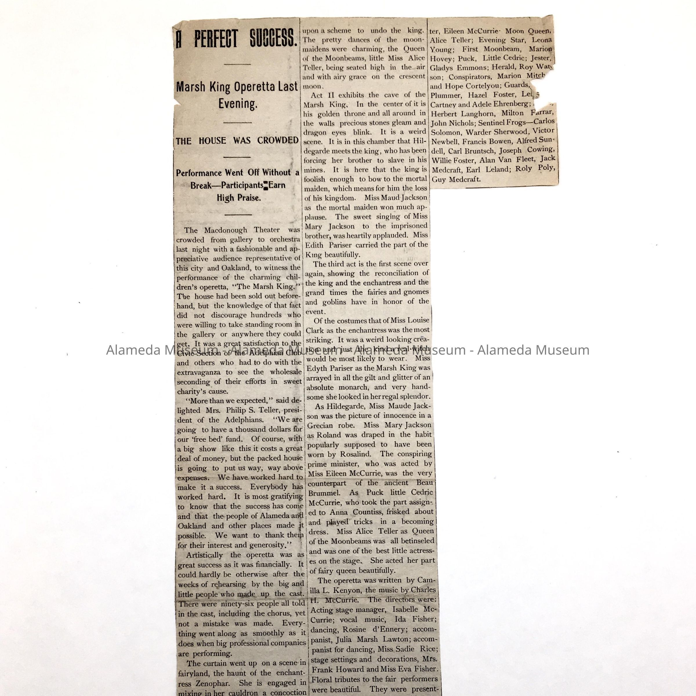 A NEWSPAPER CLIPPING CONCERNING THE PERFORMANCE OF THE OPERETTA, "THE MARSH KING," HELD AT THE MCDONOUGH THEATRE IN OAKLAND. IT WAS PERFORMED THROUGH THE CIVIC SECTION OF THE ADELPHIAN CLUB FOR CHARITABLE EVENTS. IT ALSO MENTIONS THE PERFORMANCE AND COSTUME OF LOUISE CLARK.