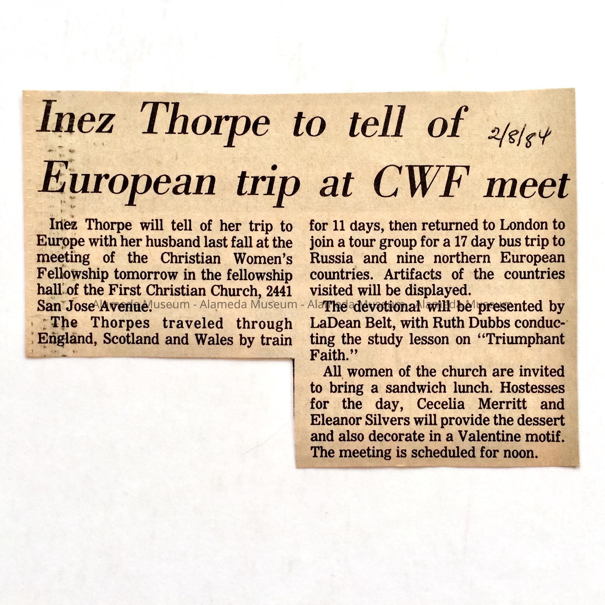A NEWSPAPER CLIPPING CONCERNING A PRESENTATION TO BE GIVEN BY INEZ THORPE OF 1177 REGENT STREET, AT THE FIRST CHRISTIAN CHURCH, 2441 SAN JOSE AVENUE, ALAMEDA. INEZ MARRIED WILLIAM, ONE OF THE THREE THORPE BROTHERS. SHE WAS A MEMBER OF THE CHURCH.
