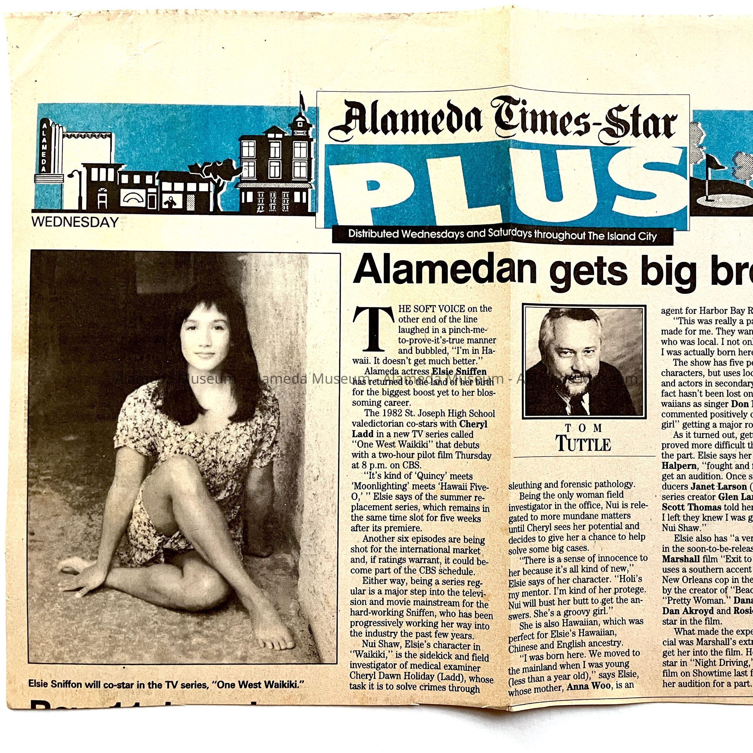 History of Object: Clipping from the Alameda Times Star of column by Tom Tuttle about actress Elsie Mapuana Sniffen landing a role in a TV series 'One West Waikiki'. Elsie was born in Hawaii, but moved to Alameda as an infant, and graduated from Saint Joseph's in 1982. She now is known as Kayla Blake. Her career includes a number of guest appearances and minor roles (e.g. Basic Instinct (1992), The Bold and The Beautiful (1988-1993), Without a Trace, Fame. Best known in the television series Sports Night (1998-2000).