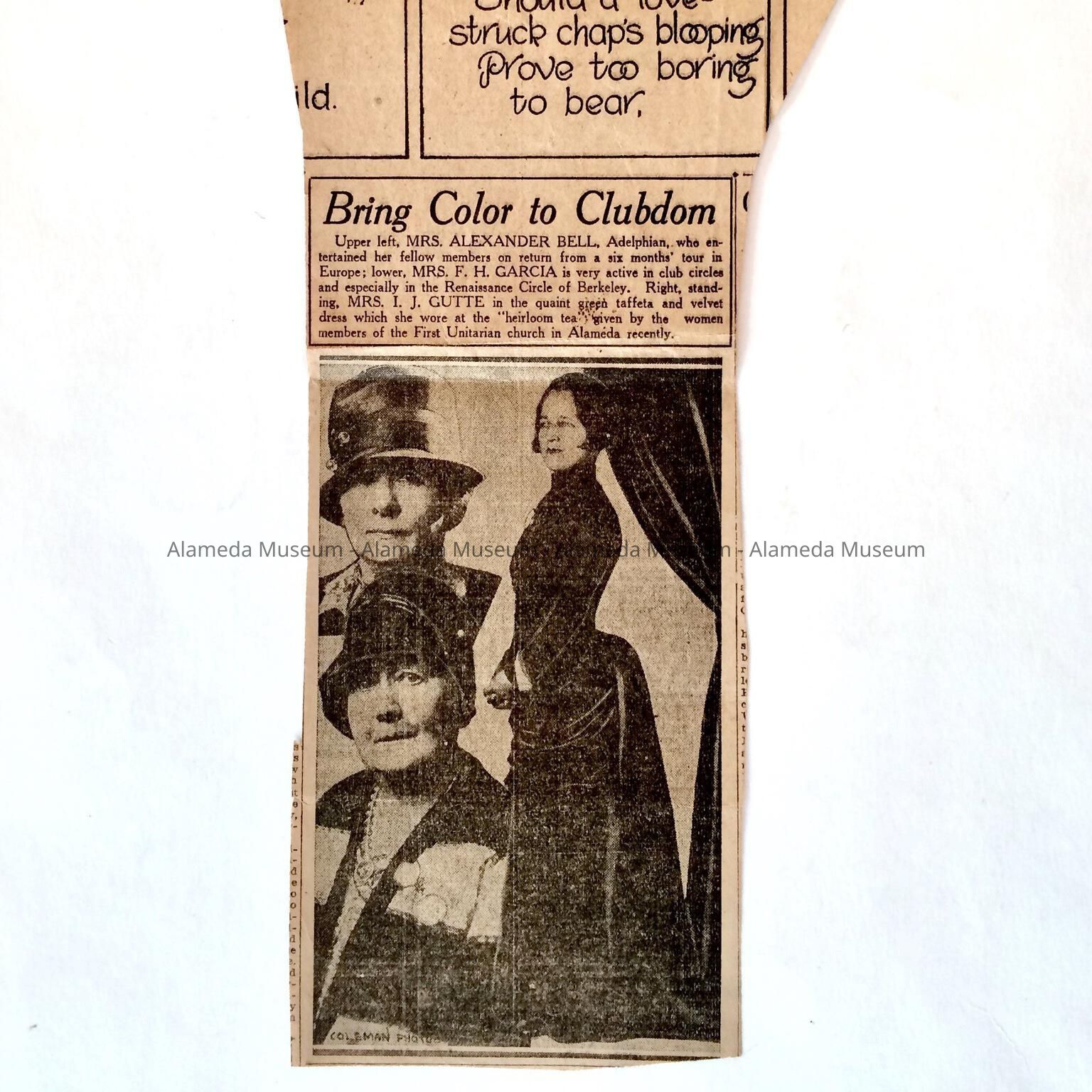 AN ILLUSTRATED NEWSPAPER CLIPPING CONCERNING MEMBERS OF THE ADELPHIAN CLUB. THEY SPONSORED AN HEIRLOOM TEA AT THE FIRST UNITARIAN CHURCH OF ALAMEDA.