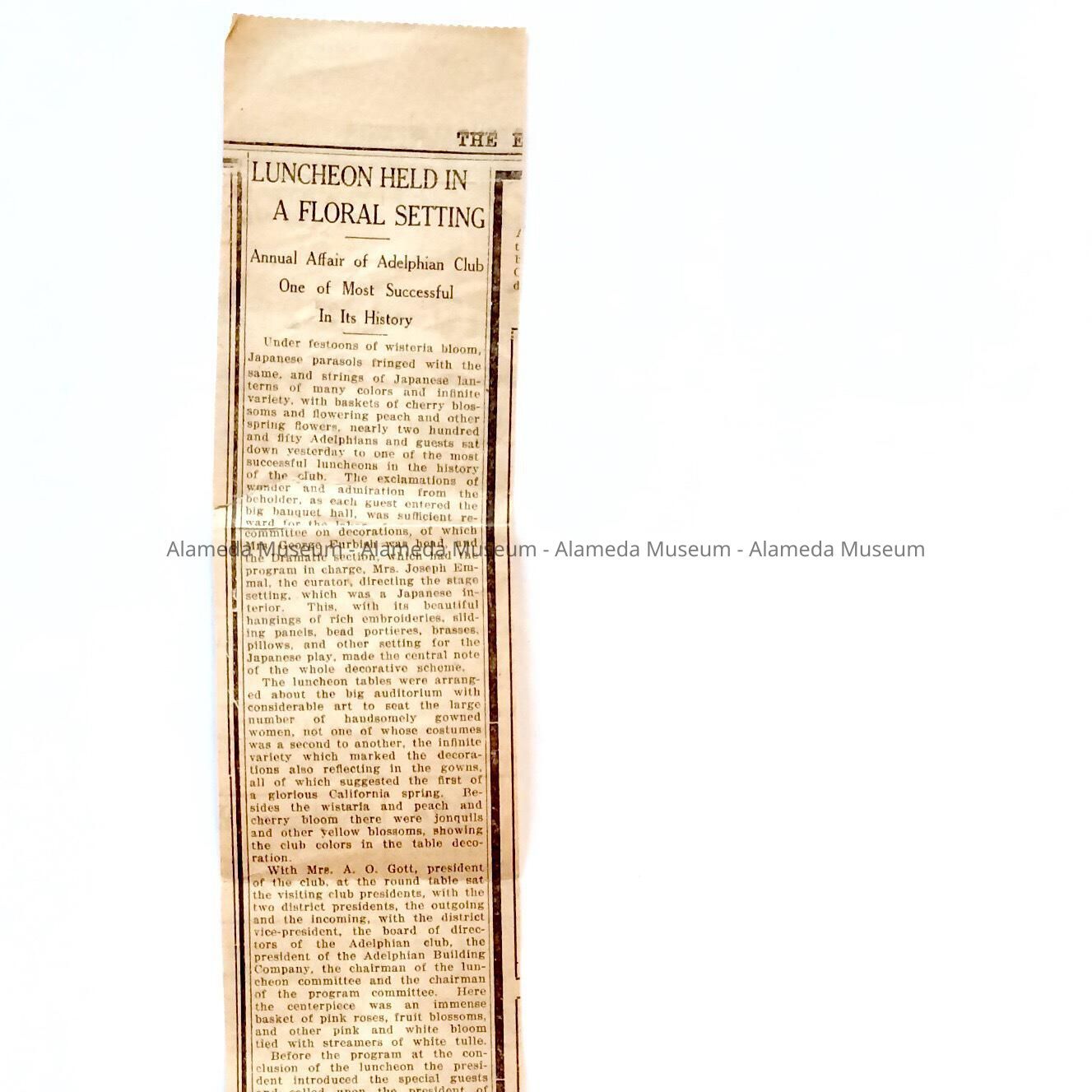 Clipping about an Adelphian Club luncheon with Japanese floral theme, c. 1920sEntry/Object ID