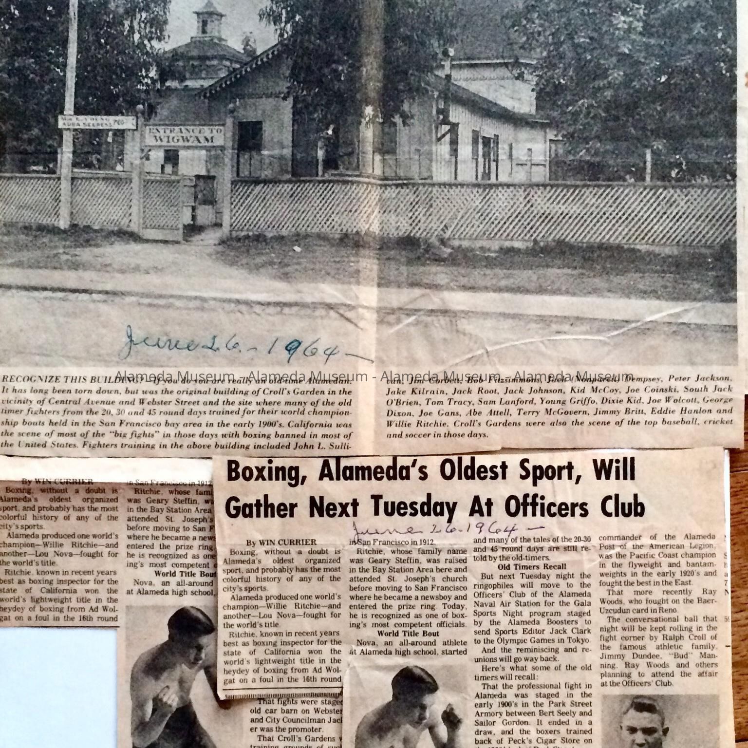History of Object: Clippings of article by Alameda Times Star sports writer Win Currier, which was published in June 26, 1964, discussing early boxing champions that trained at the Wigwam at Croll's Gardens. The occasion was an event staged by the Alameda Boosters at the Officers Club of NAS to send sports Editor Jack Clark to the Olympic Games in Tokyo.
