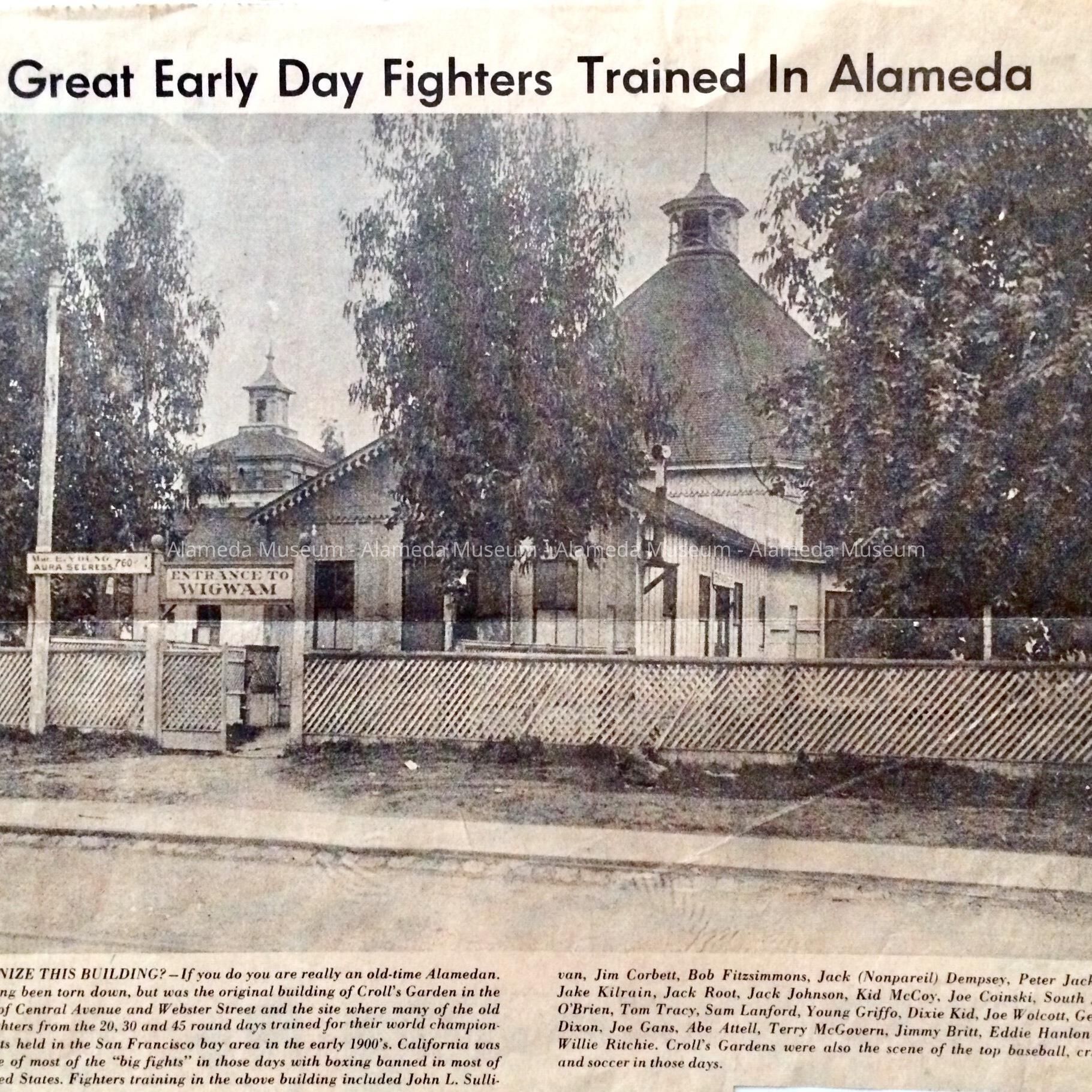 A: Clipping, showing the image of a building, and two of people in a boxing pose. Headline: 'Great Early Day Fighters Trained in Alameda', subtitle 'Boxing, Alameda's Oldest Sport, Will Gather Next Tuesday at Officers Club'.