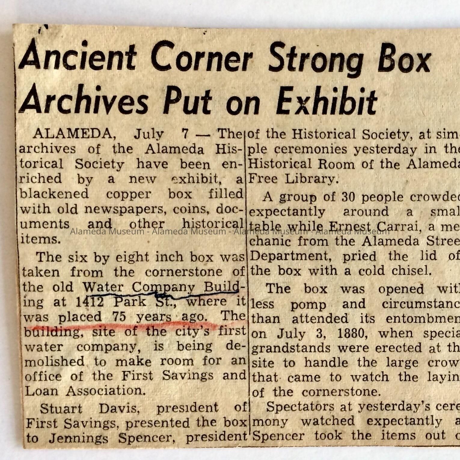 HISTORY OF OBJECT: NEWSPAPER CLIPPING DATED JULY 7, 1955 CONCERNING THE DISPLAY OF THE CONTENTS OF THE CORNERSTONE BOX OF THE WATER COMPANY BUILDING AT 1412 PARK STREET, ALAMEDA. THE EXHIBIT WAS ON VIEW AT THE ALAMEDA HISTORICAL SOCIETY MUSEUM LOCATED IN THE BASEMENT OF THE ALAMEDA FREE LIBRARY.