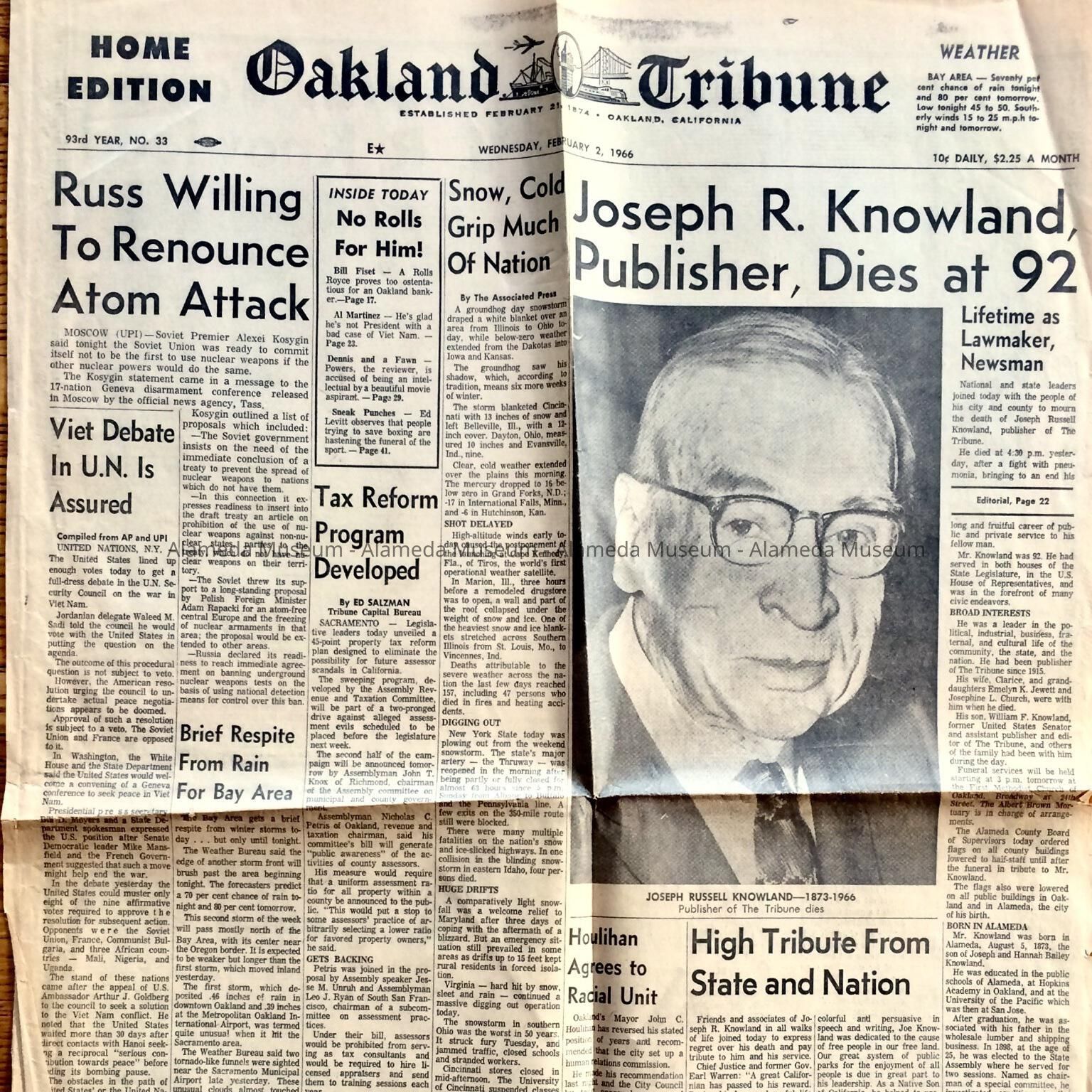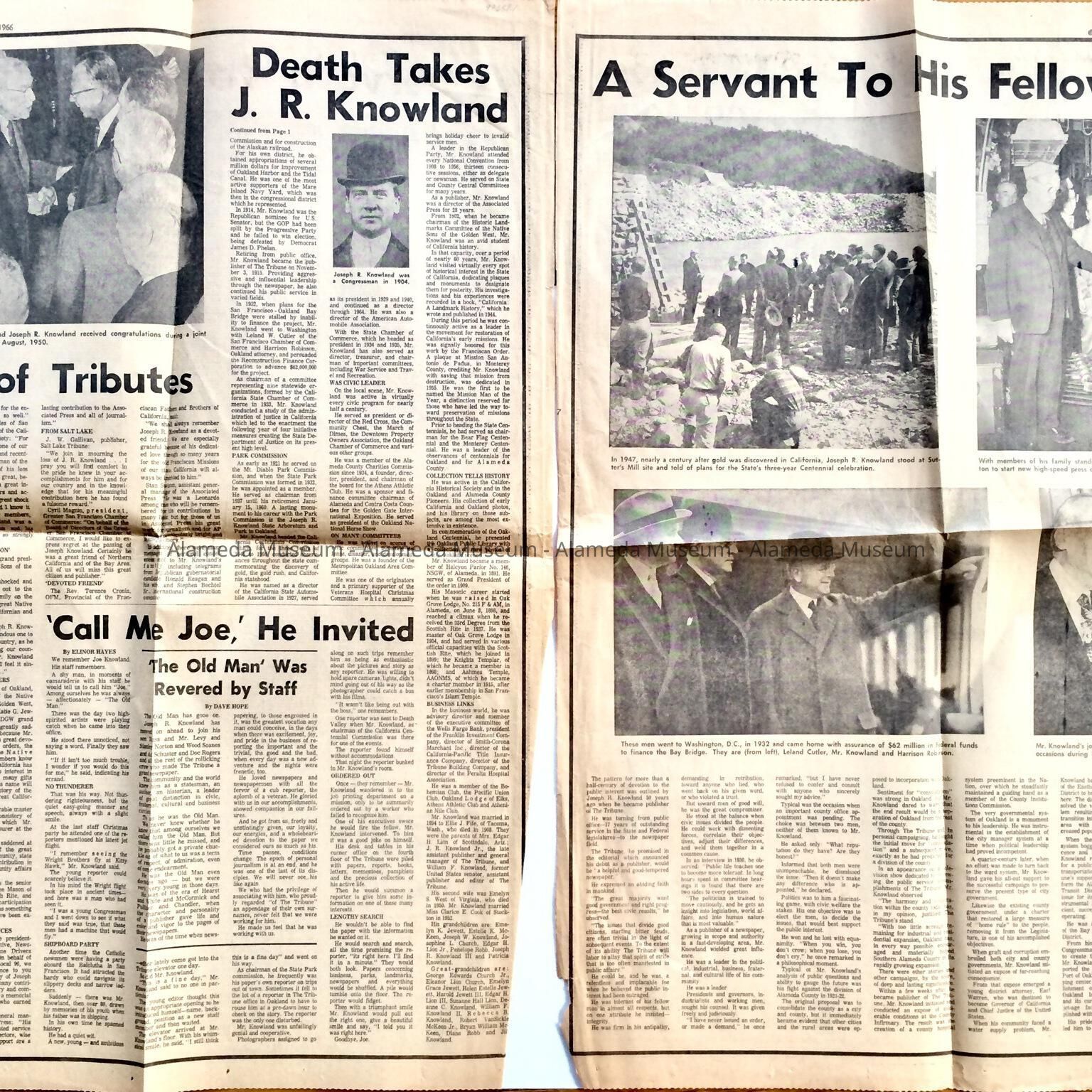 History: Illustrated article concerning the death of Joseph R. Knowland which appeared in the Oakland Tribune February 2, 1966. Mr. Knowland was born in Alameda on August 5, 1873 and was a member of a pioneer family.