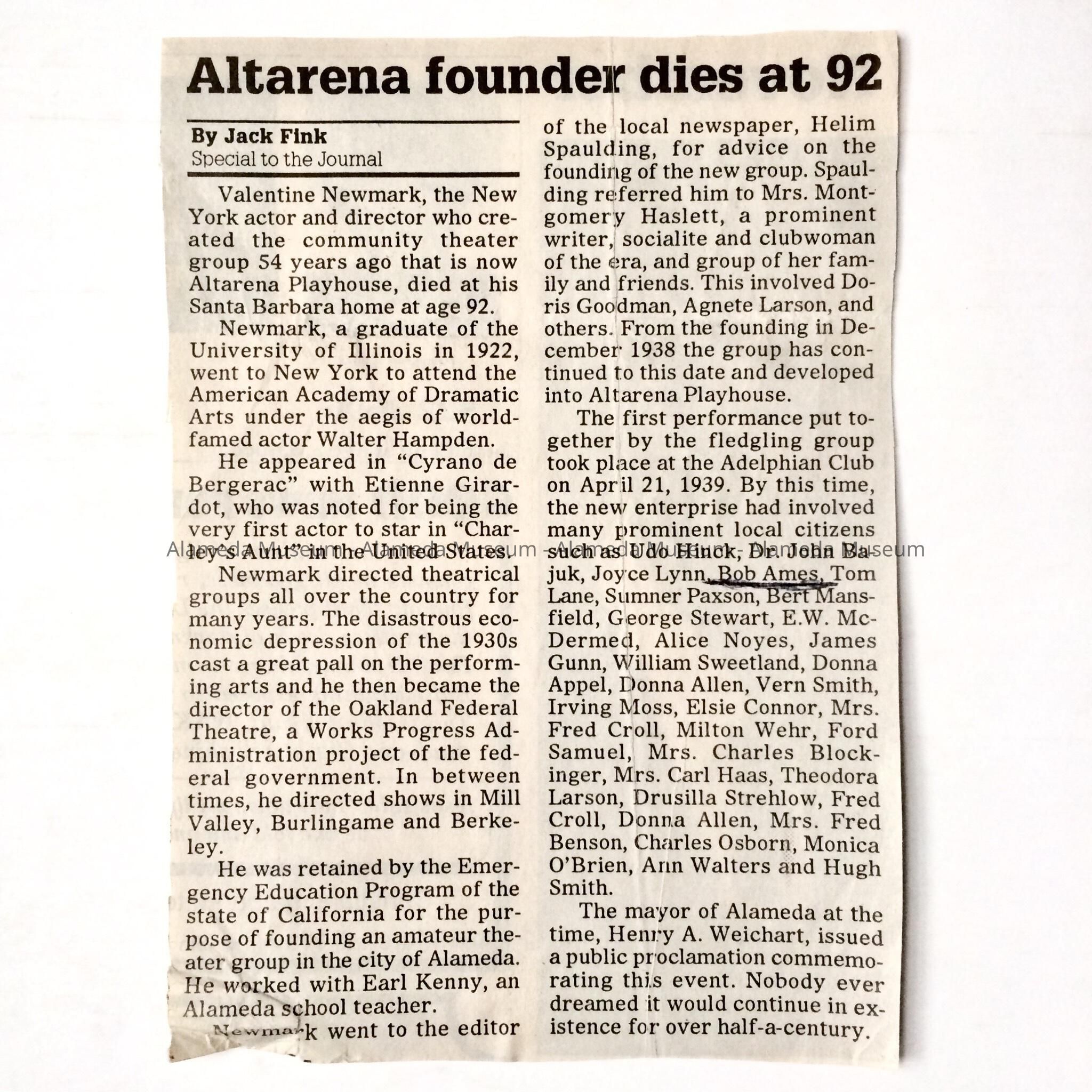 Clipping about death of Valentine Newmark, founder Altarena Playhouse, 1992Entry/Object ID