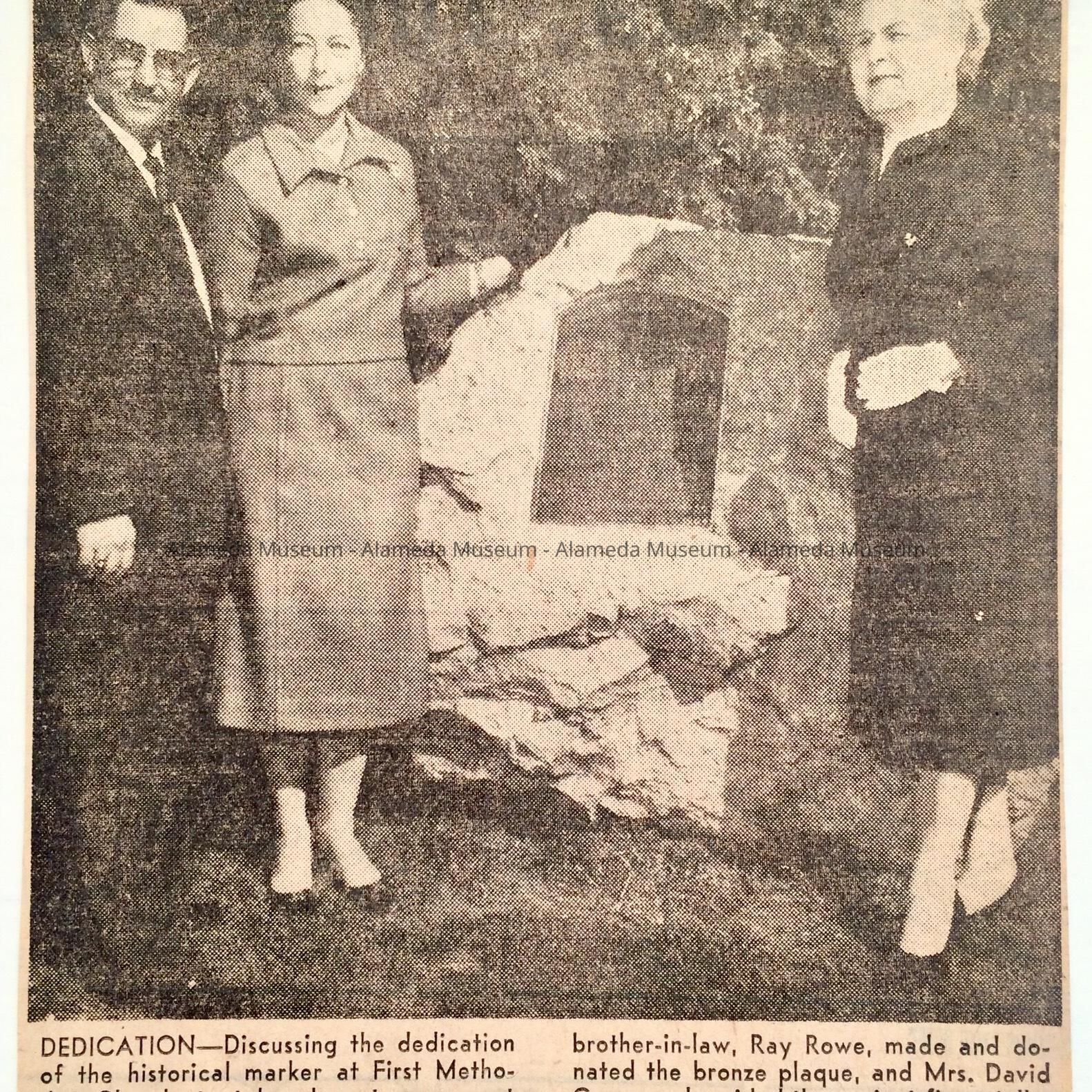 History: Illustrated newspaper clipping showing the dedication of the Historic Plaque at the First Methodist Church, Central and Oak, Mayor William McCall officiating. Clipping is from the Alameda Times Star dated February 25, 1962. In collection prior to 1971 and never catalogued.