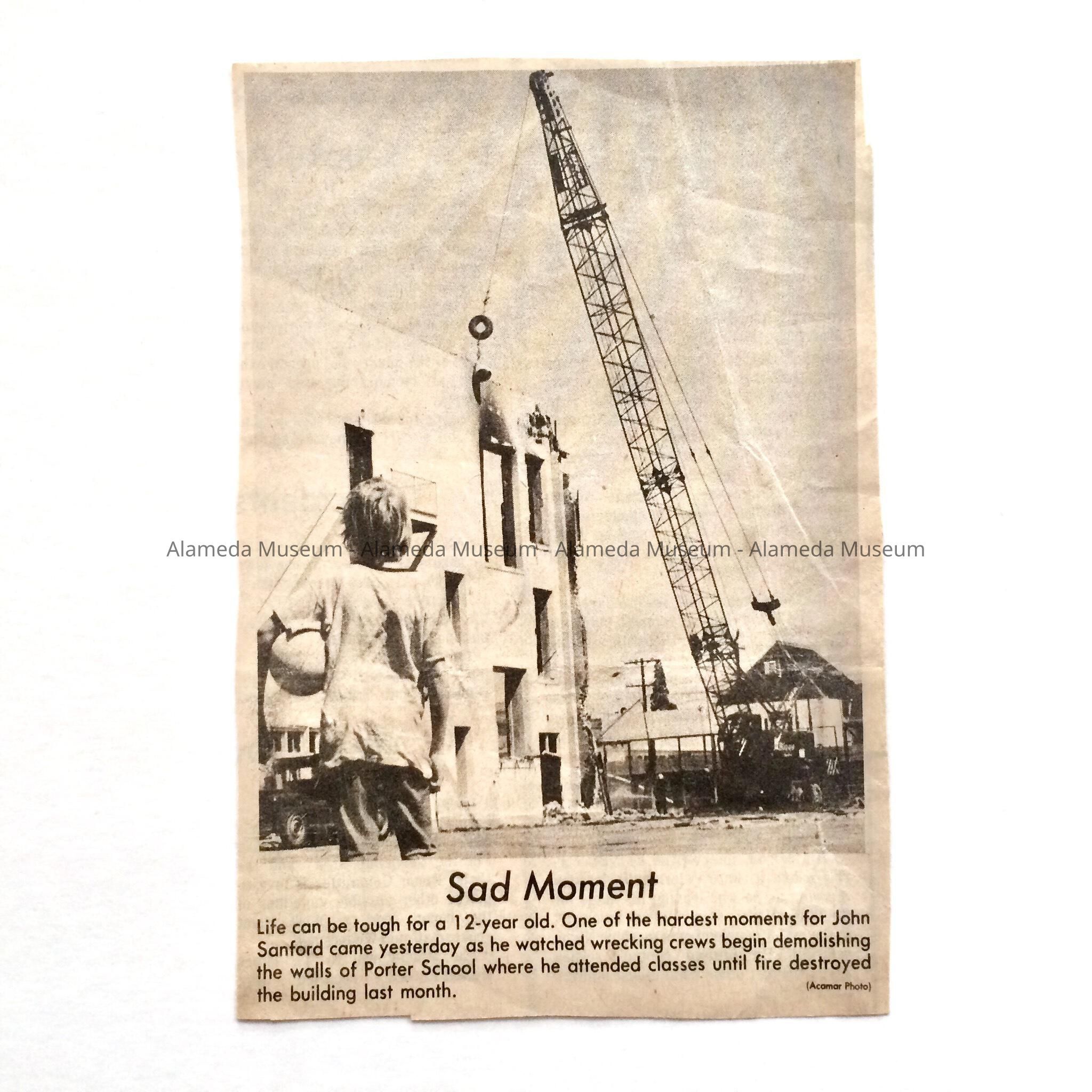 HISTORY OF OBJECT: NEWSPAPER CLIPPING WITH ILLUSTRATION DEPICTING THE DEMOLITION OF THE PORTER SCHOOL IN ALAMEDA.