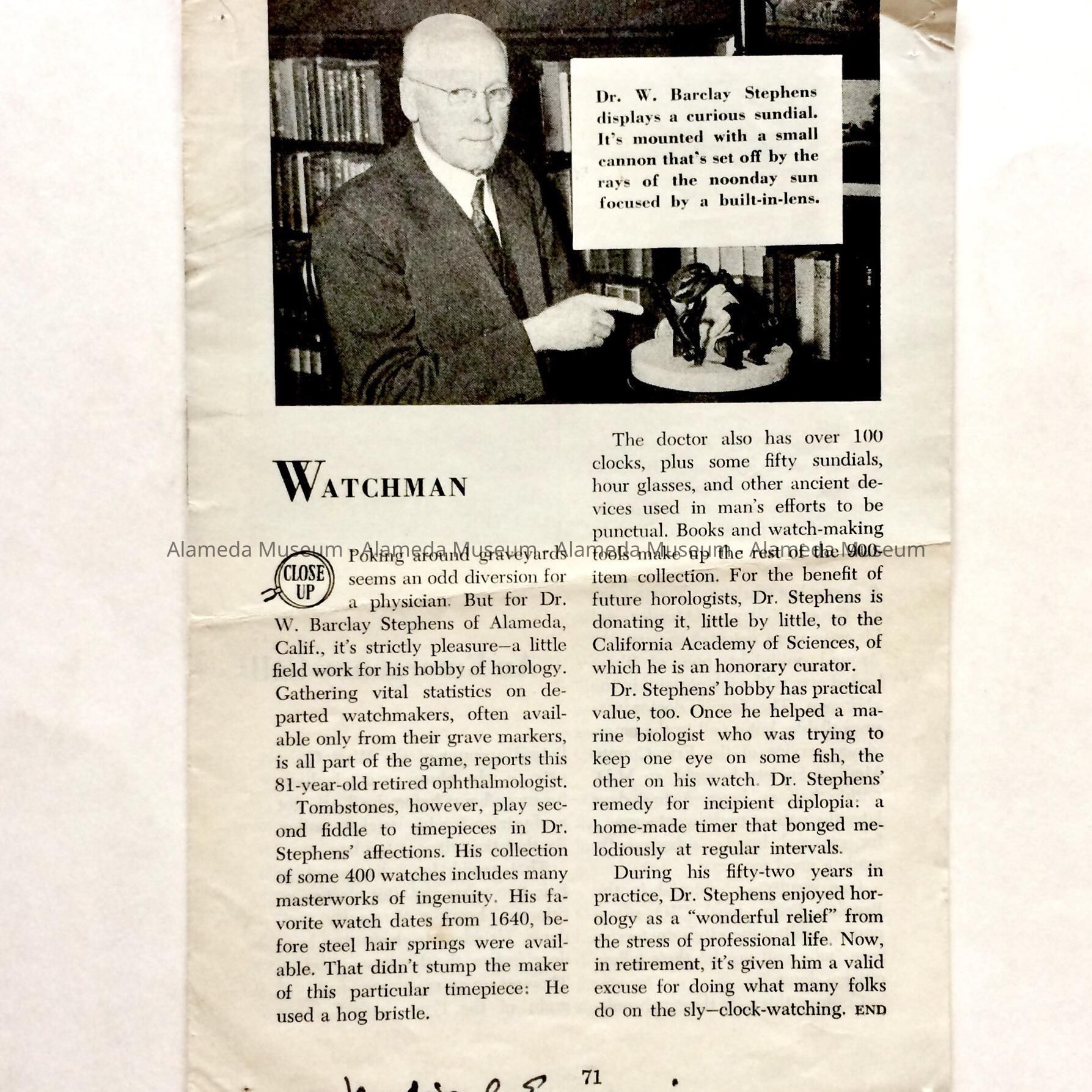 Clipping about Dr. Stephens' interest in Clocks and Watches, before 1970Entry/Object ID