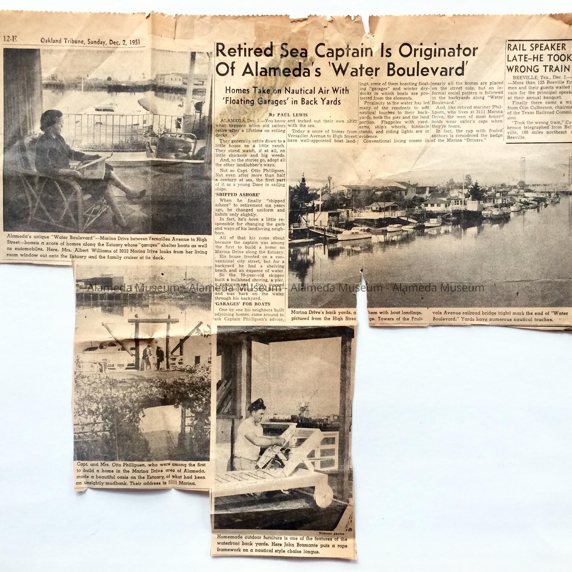 ILLUSTRATED NEWSPAPER CLIPPING FROM THE "OAKLAND TRIBUNE," DECEMBER 22, 1951, CONCERNING HOMES IN THE MARINA DRIVE DISTRICT ALONG THE ESTUARY. THE ARTICLE ALSO REFERS TO CAPTAIN OTTO PHILLIPSEN, WHO WAS ONE OF THE EARLY RESIDENTS OF THE AREA.