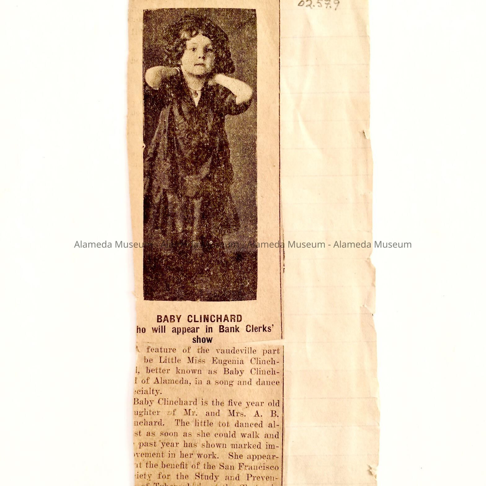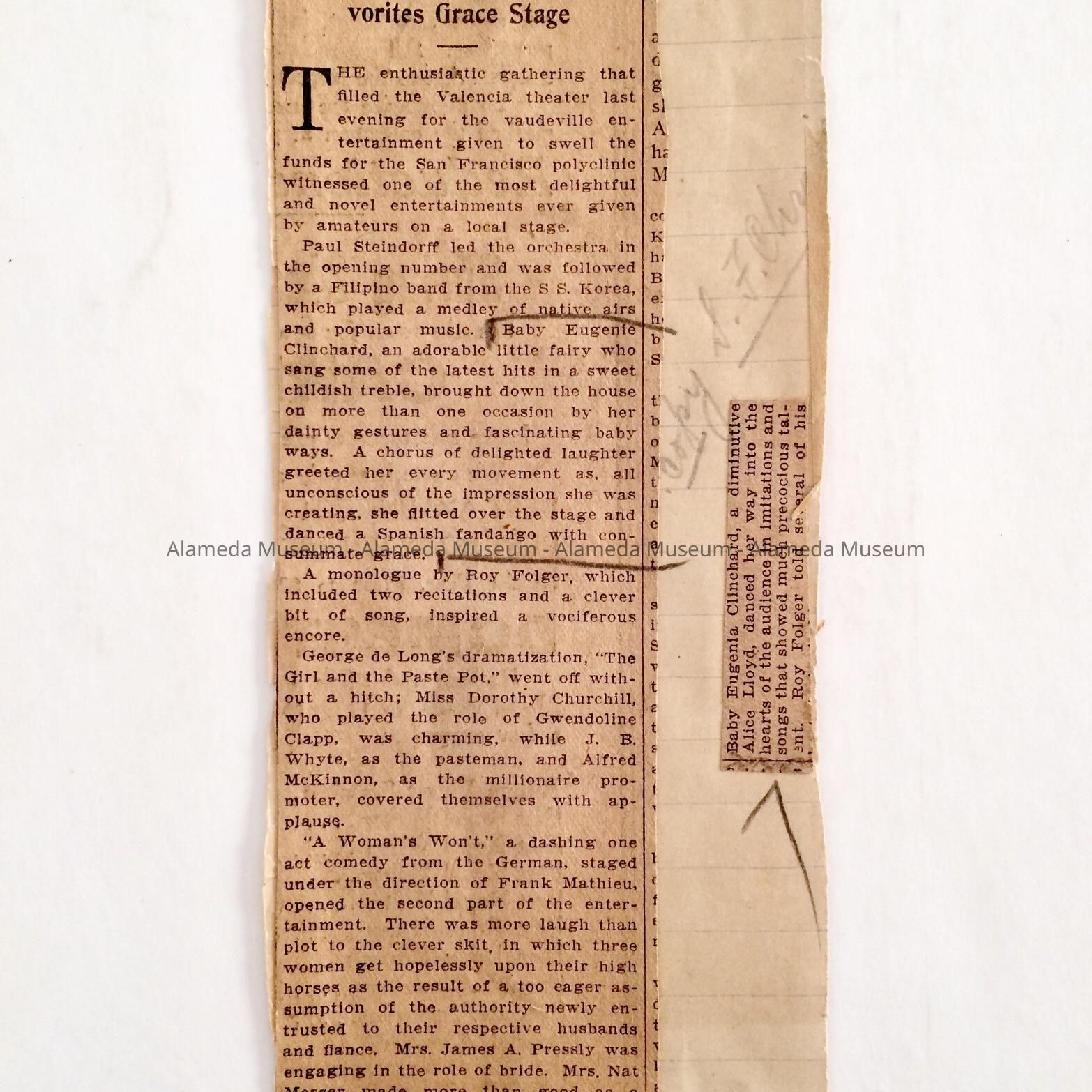Illustrated newspaper clipping concerning the Alameda child star, Eugenia Clinchard, appearing in theatrical productions.
