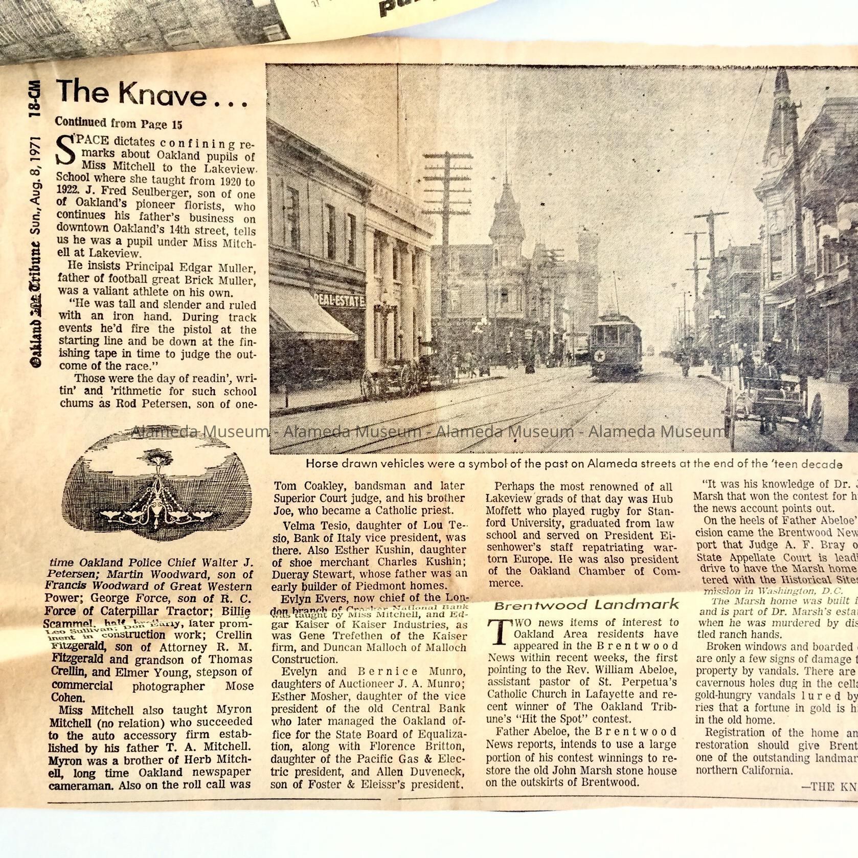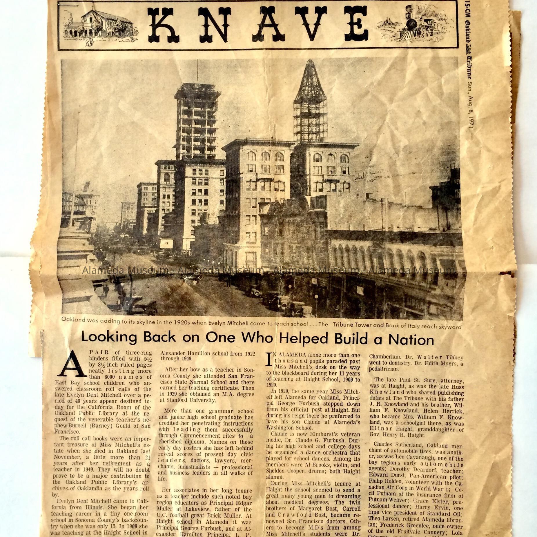 History: Clipping from the "Knave" section of the Oakland Tribune, August 8, 1971 edition concerning the late Evelyn Dent Mitchell. Ms. Mitchell taught for 11 years at Haight School from 1909-1920. The article talks about her career.