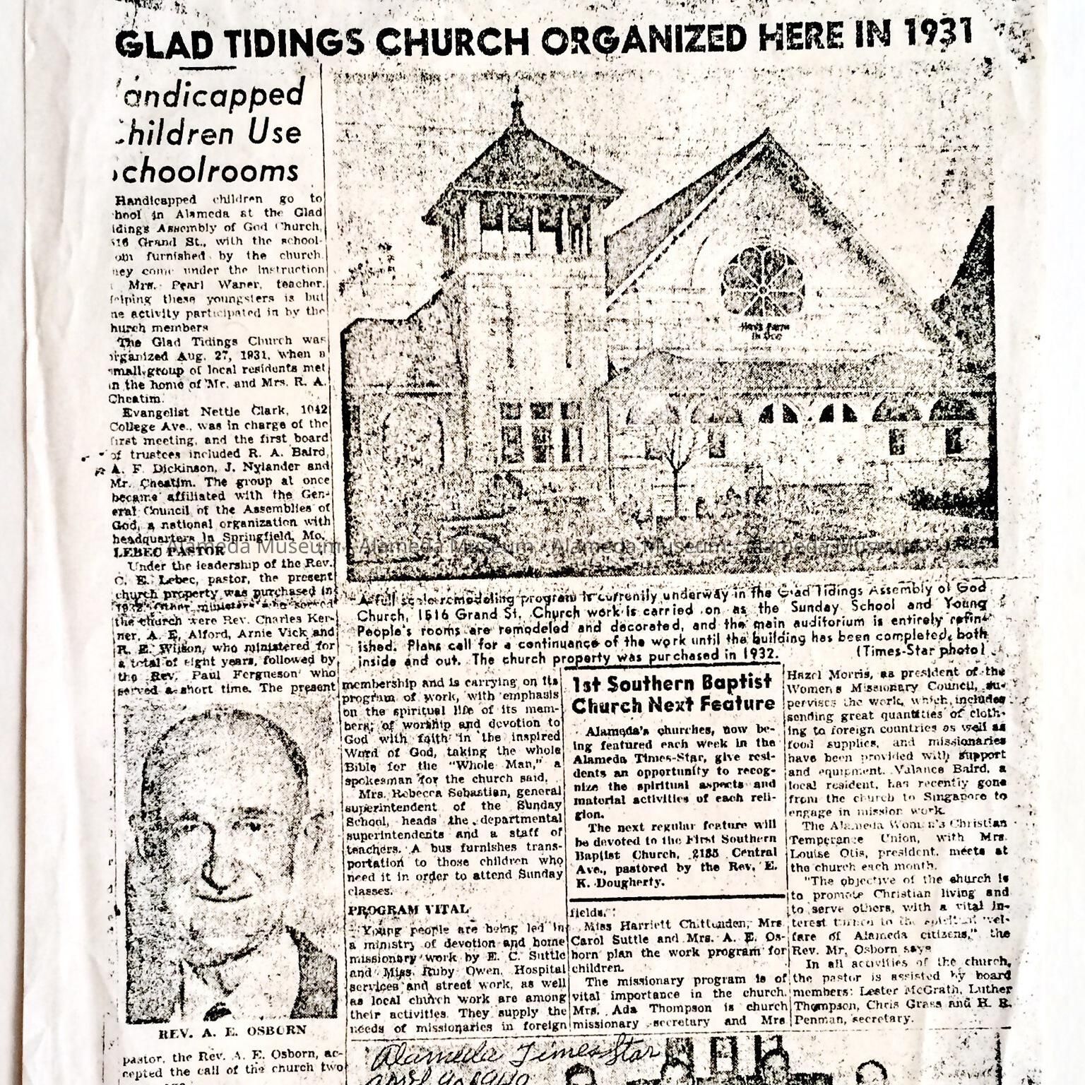 History: Newspaper clipping concerning the Assembly of God church at 1516 Grand Street formerly the Unitarian Church building. The Glad Tidings Church was organized August 31, 1931.