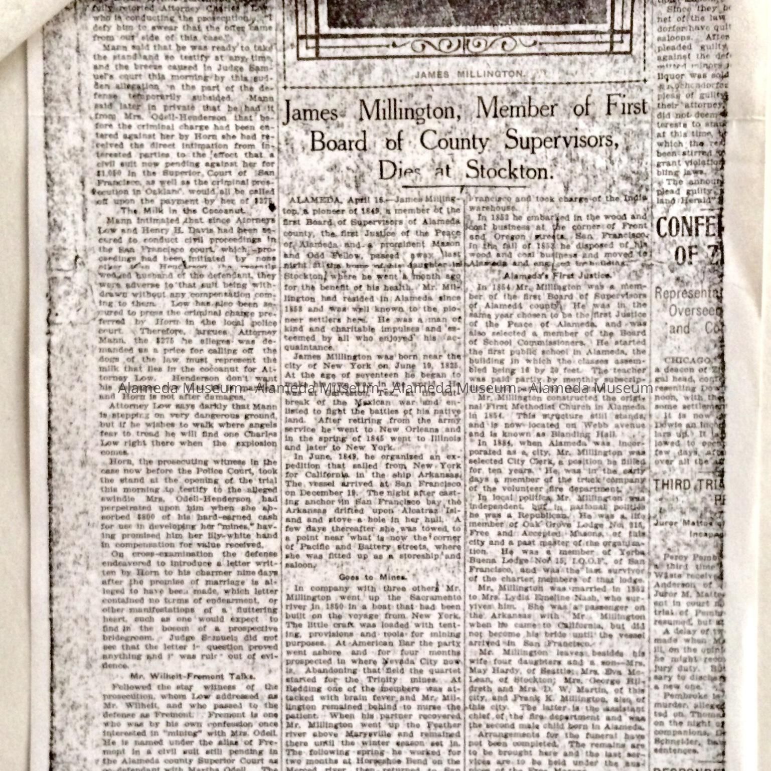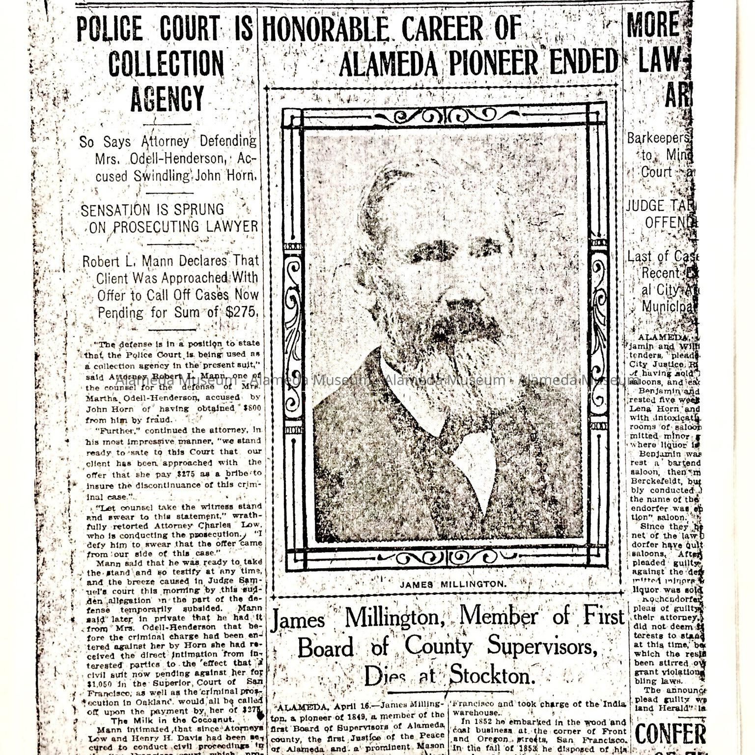 A NEWSPAPER CLIPPING CONTAINING A PORTRAIT OF JAMES MILLINGTON, PIONEER RESIDENT OF ALAMEDA AND ONE-TIME ALAMEDA CITY CLERK.