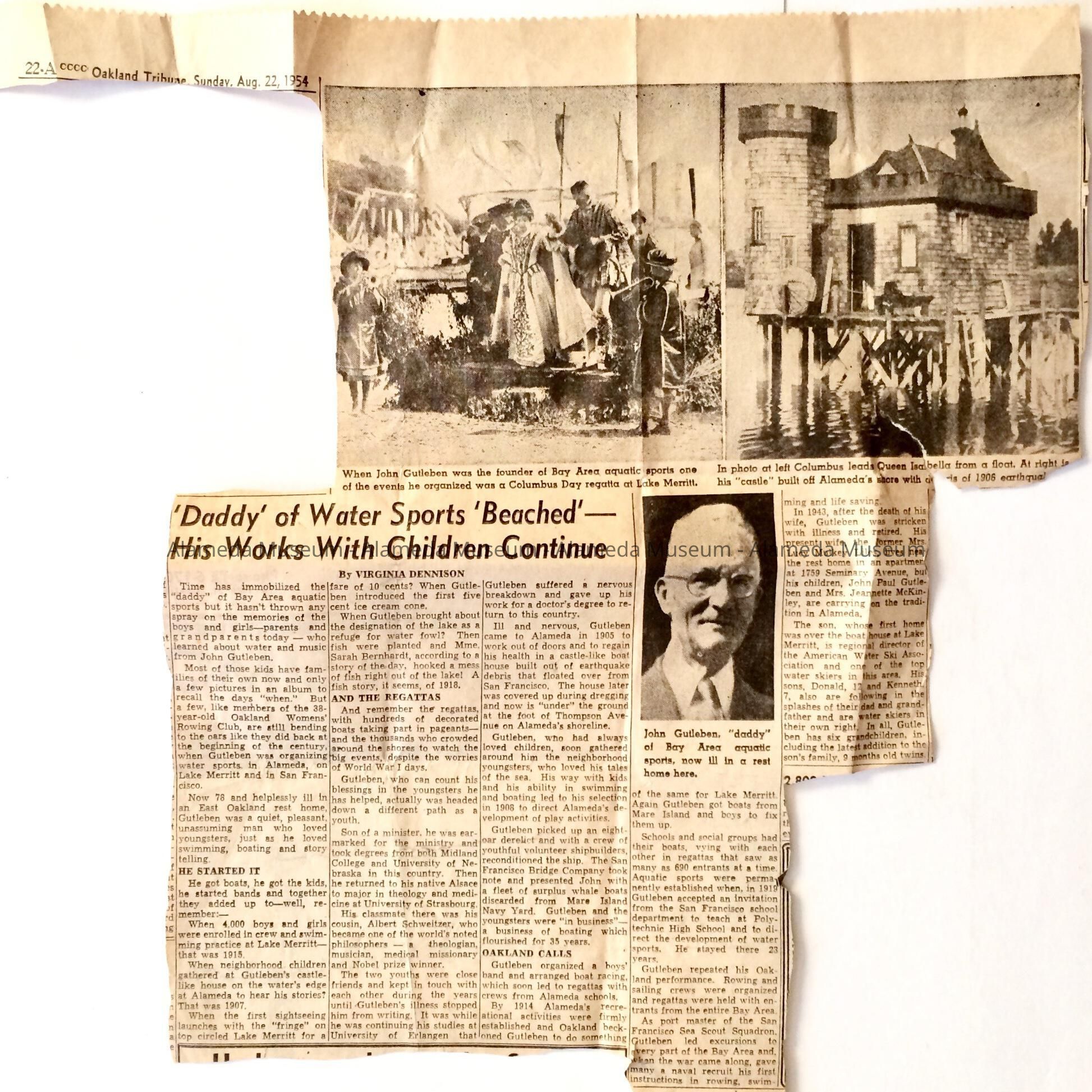 AN ILLUSTRATED NEWSPAPER CLIPPING CONCERNING JOHN GUTLEBEN, WHO BUILT A CASTLE-STYLE BOAT. THE CRAFT WAS ORIGINALLY LOCATED ON SAN LEANDRO BAY. PHOTOGRAPHS OF THE BOAT ARE IN THE MUSEUM COLLECTION. MR GUTLEBEN WAS PROMINENT IN THE PARK AND RECREATION DEPARTMENTS IN ALAMEDA AND OAKLAND.