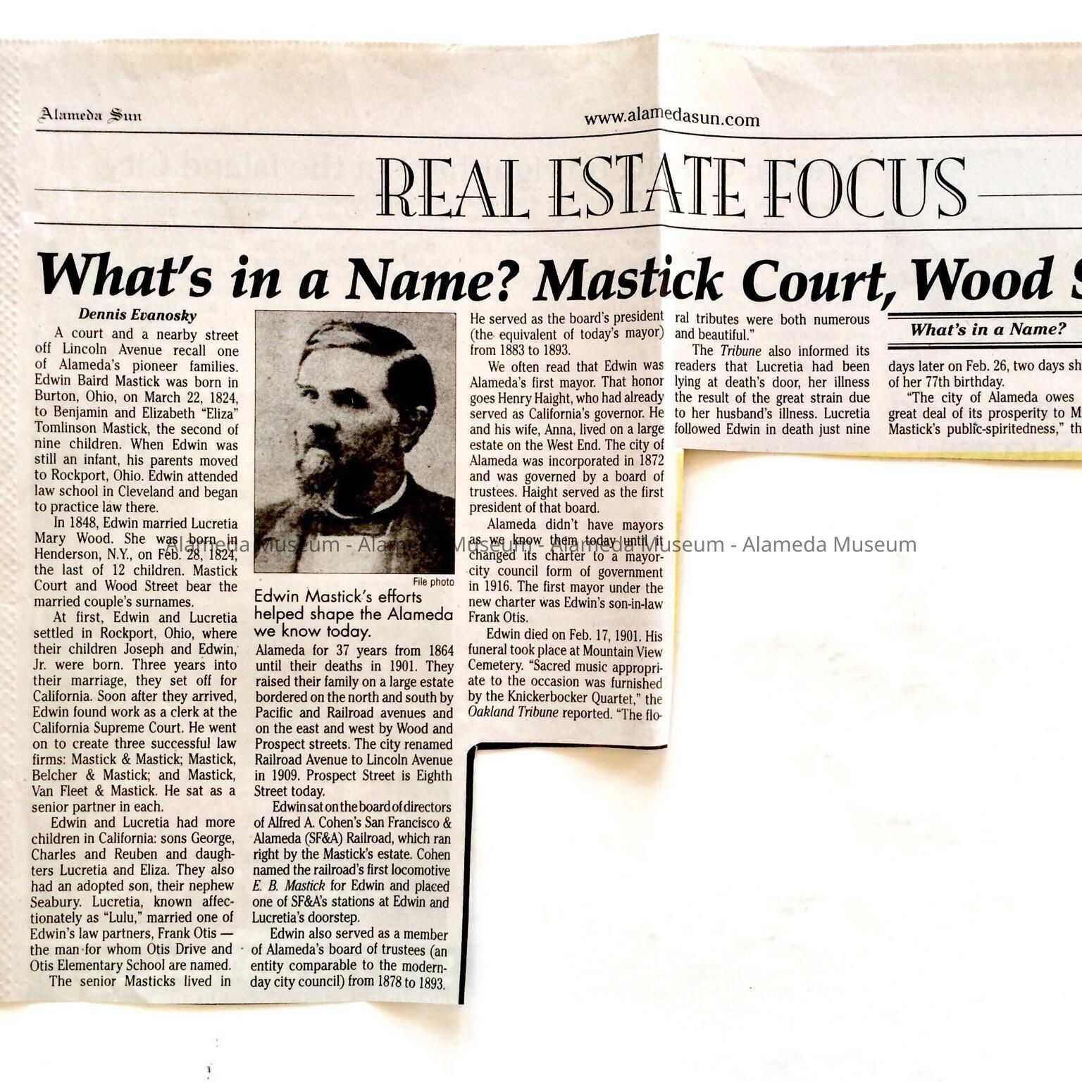 Newspaper clipping of a section titled ‘Real Estate Focus’, title of article: ‘What’s in a name? Mastick Court, Wood Street’, from the ‘Alameda Sun’ edition of July 13, 2017.