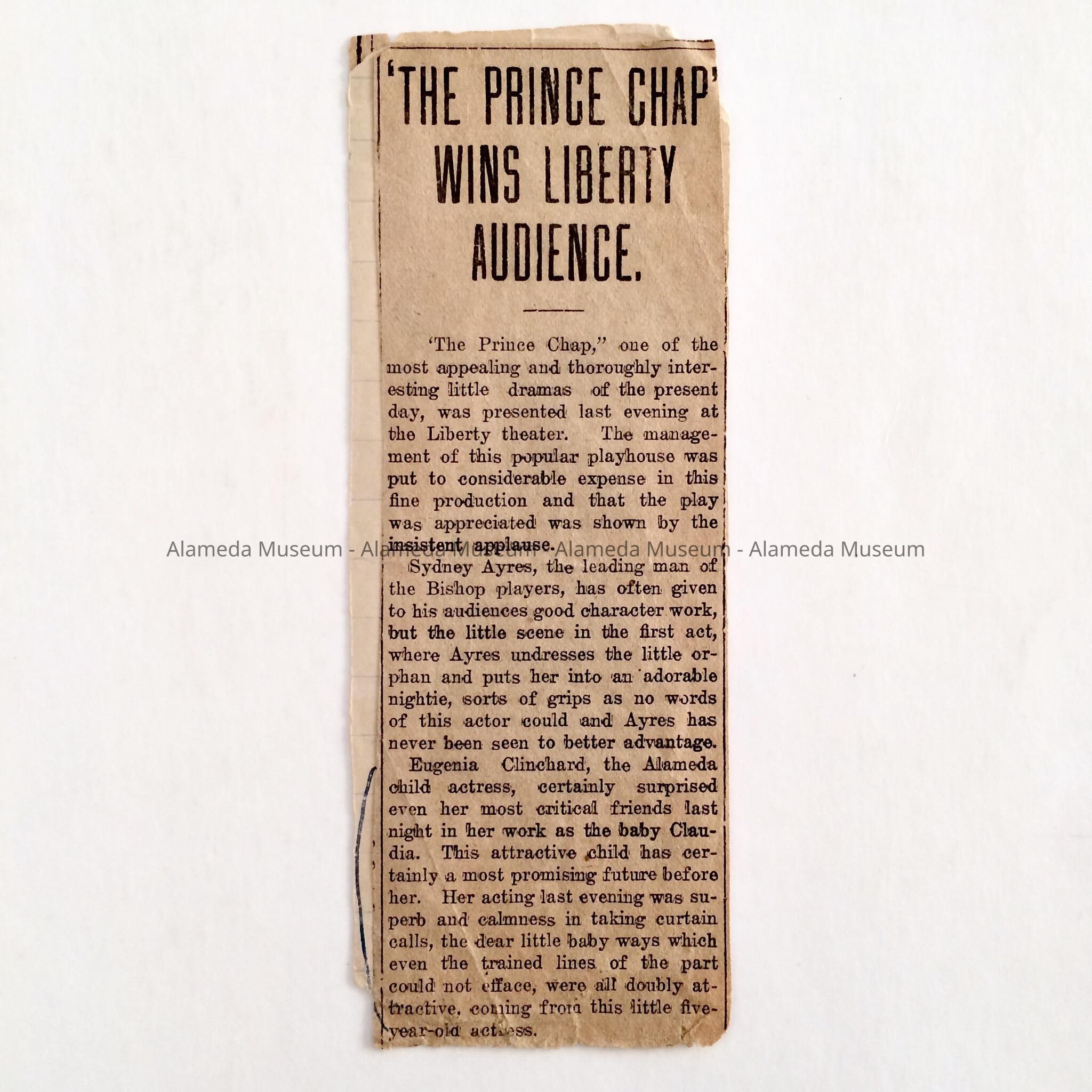 Newspaper clipping concerning the play, “The Prince Chap”, performed at the Liberty Theatre, Oakland, and featuring the Alameda child actress, Eugenia Clinchard.