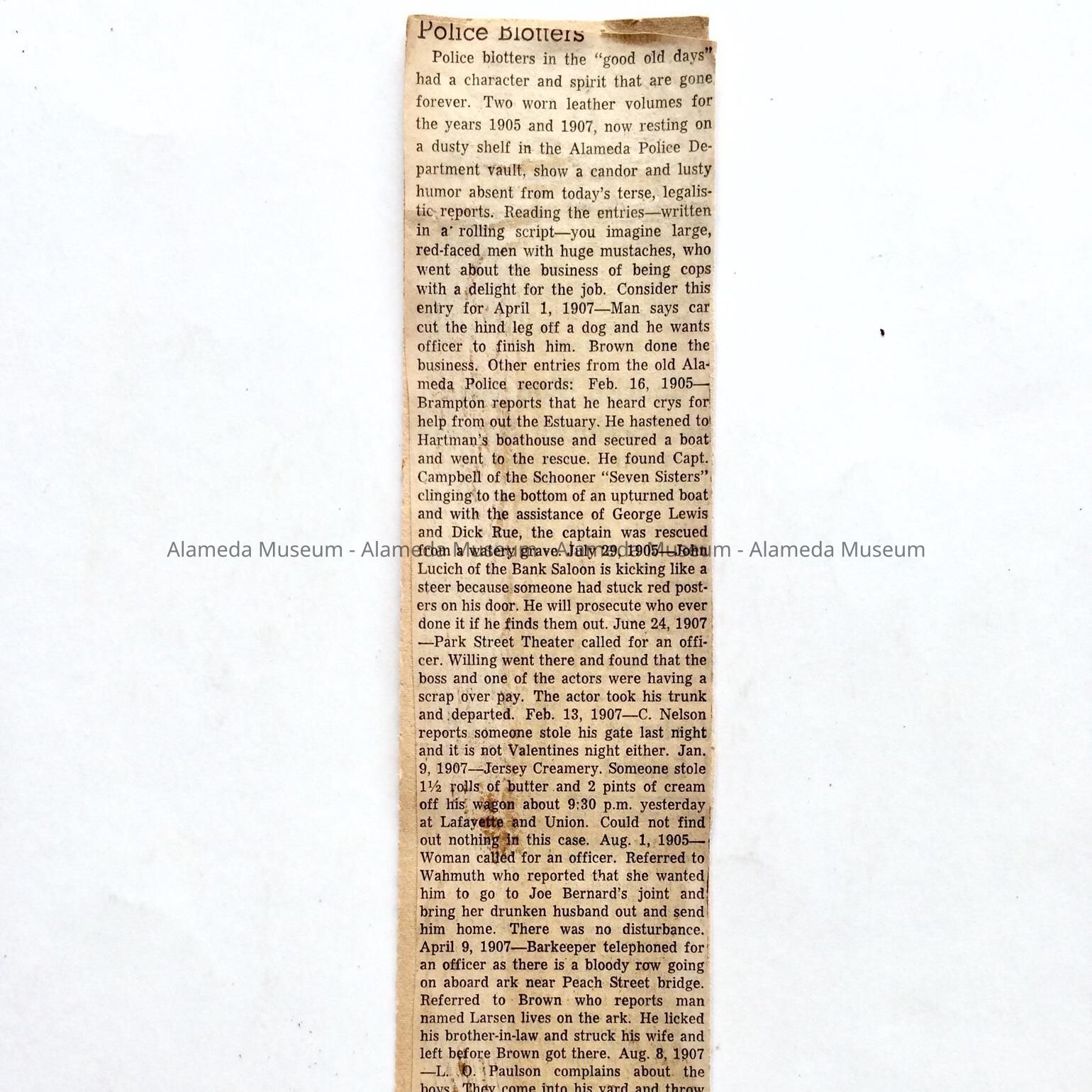 History: Newspaper clipping concerning the police blotters of the period 1905-07. clipping appeared in the Oakland Tribune.