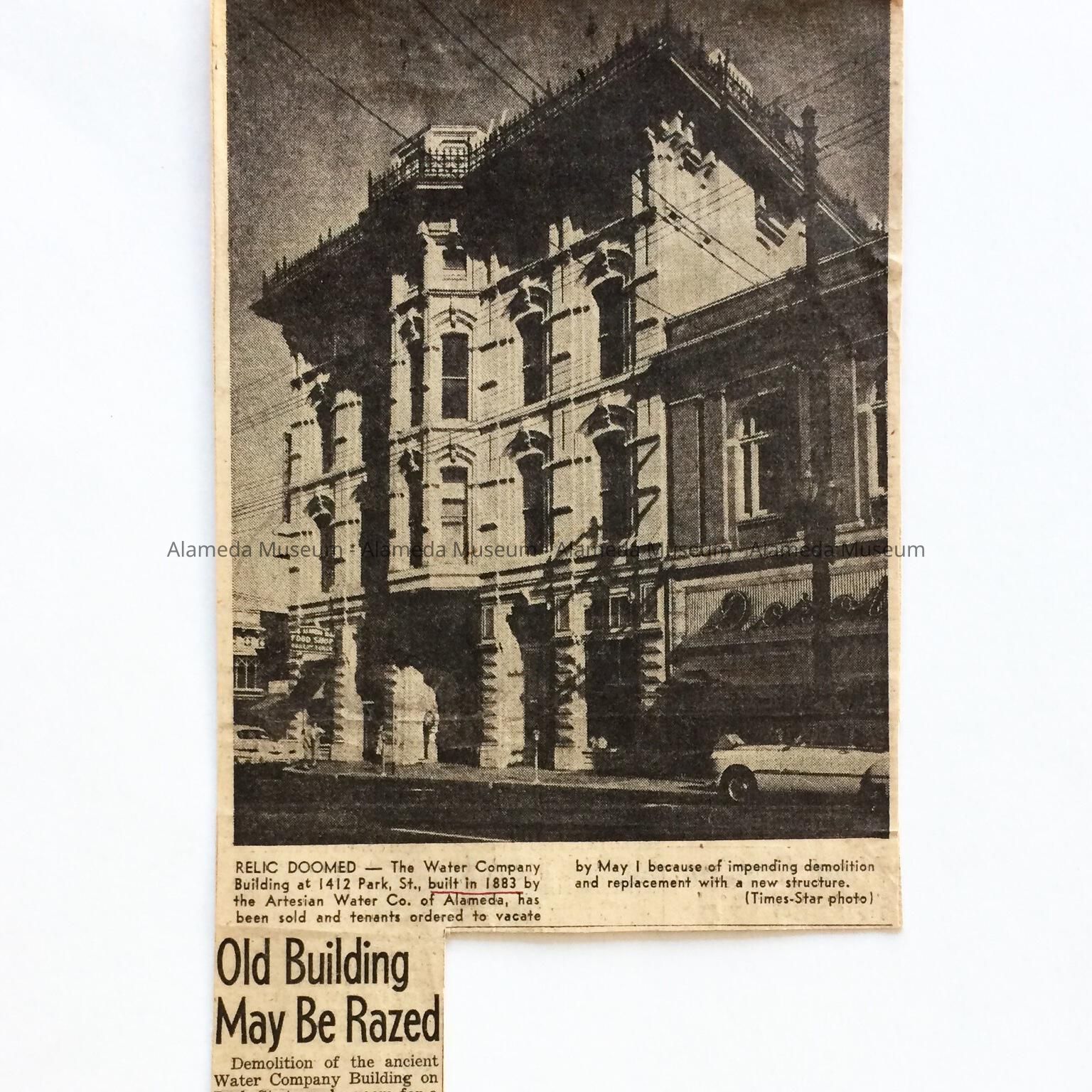 HISTORY OF OBJECT: AN ILLUSTRATED NEWSPAPER CLIPPING CONCERNING THE POSSIBLE DEMOLITION OF THE WATER WORKS BUILDING AT 1412 PARK STREET, LOCATION OF THE OFFICE OF THE ARTESIAN WATER COMPANY.