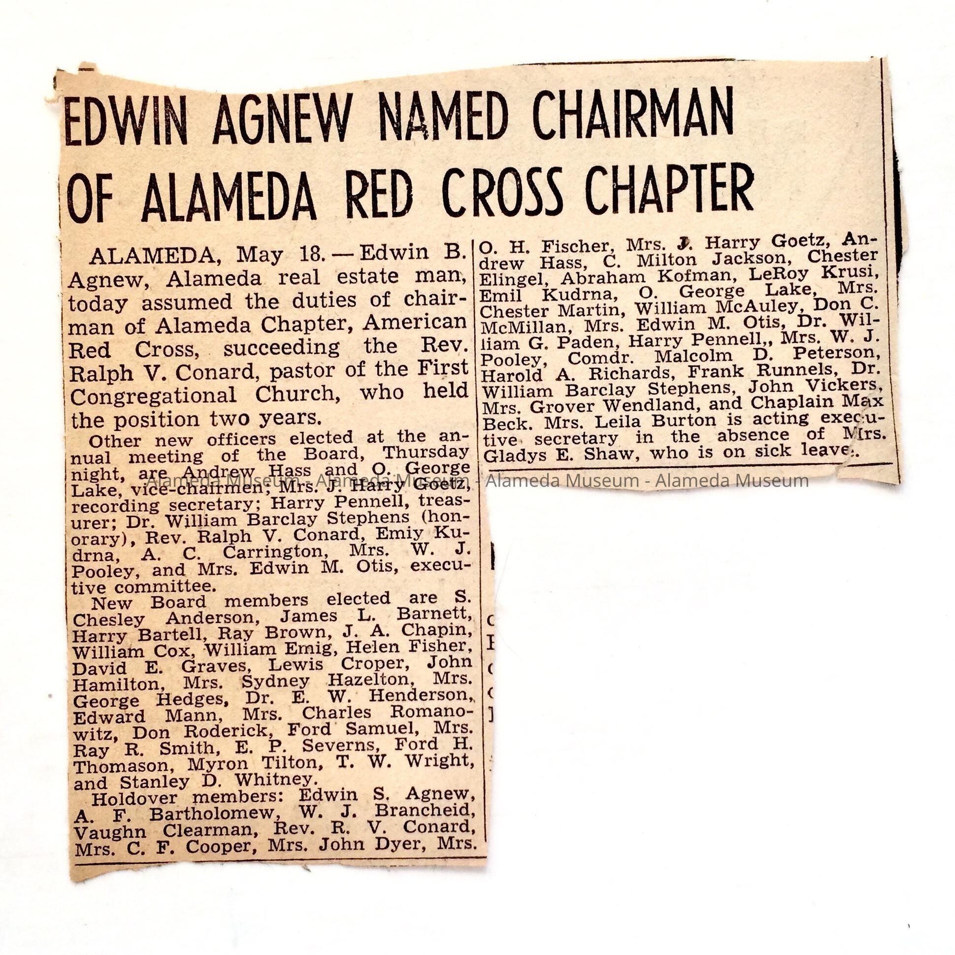 HISTORY OF OBJECT: A NEWSPAPER CLIPPING, DATED MAY 18 (YEAR NOT INDICATED), LISTING EDWIN G. AGNEW, ALAMEDA REALTOR, AS CHAIRMAN OF THE AMERICAN RED CROSS. NAMES OF OTHER BOARD MEMBERS AND PARTICIPANTS OF THE AMERICAN RED CROSS ARE ALSO LISTED.