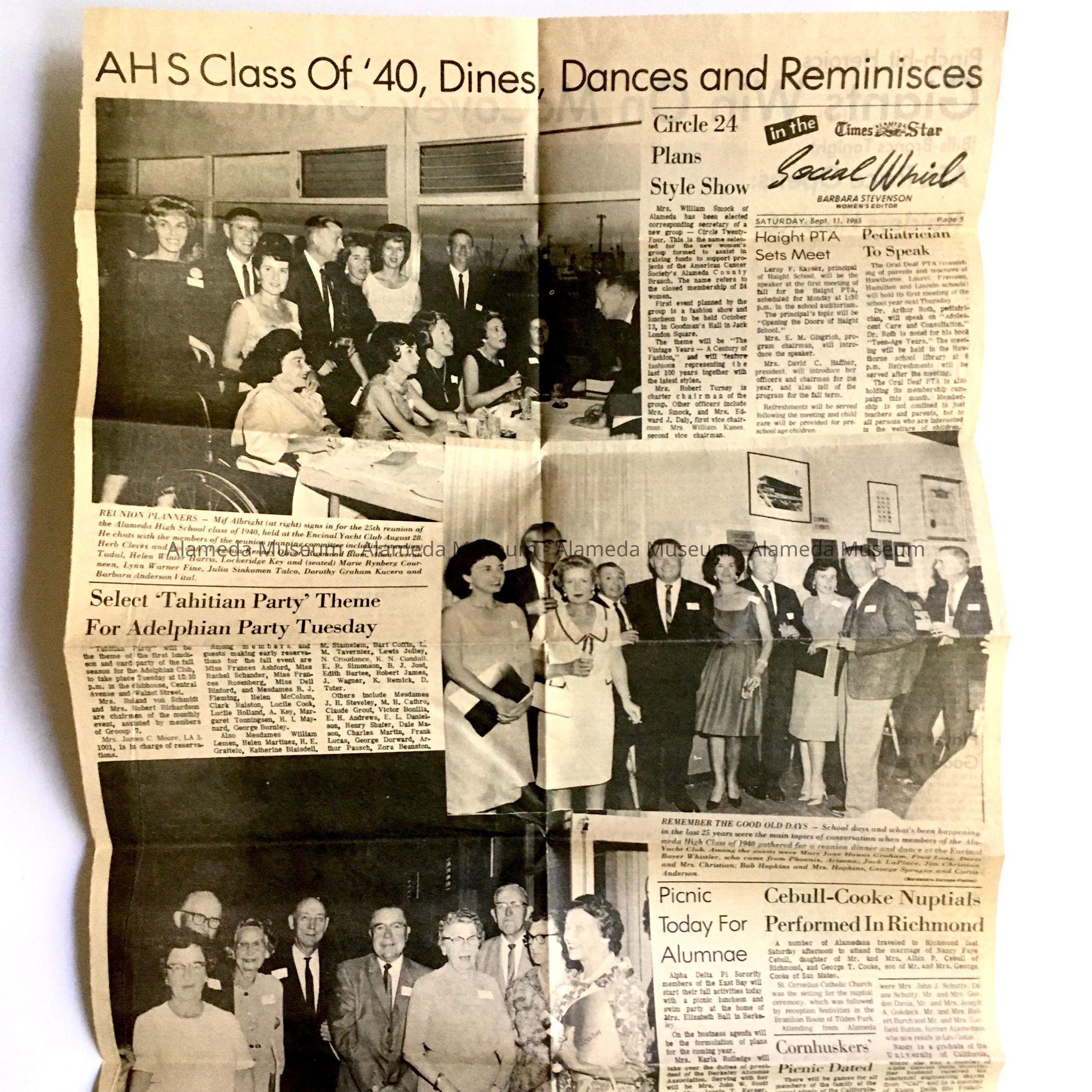 Illustrated newspaper clipping dated September 11, 1965 concerning the reunion of the class of 1940, Alameda High School.